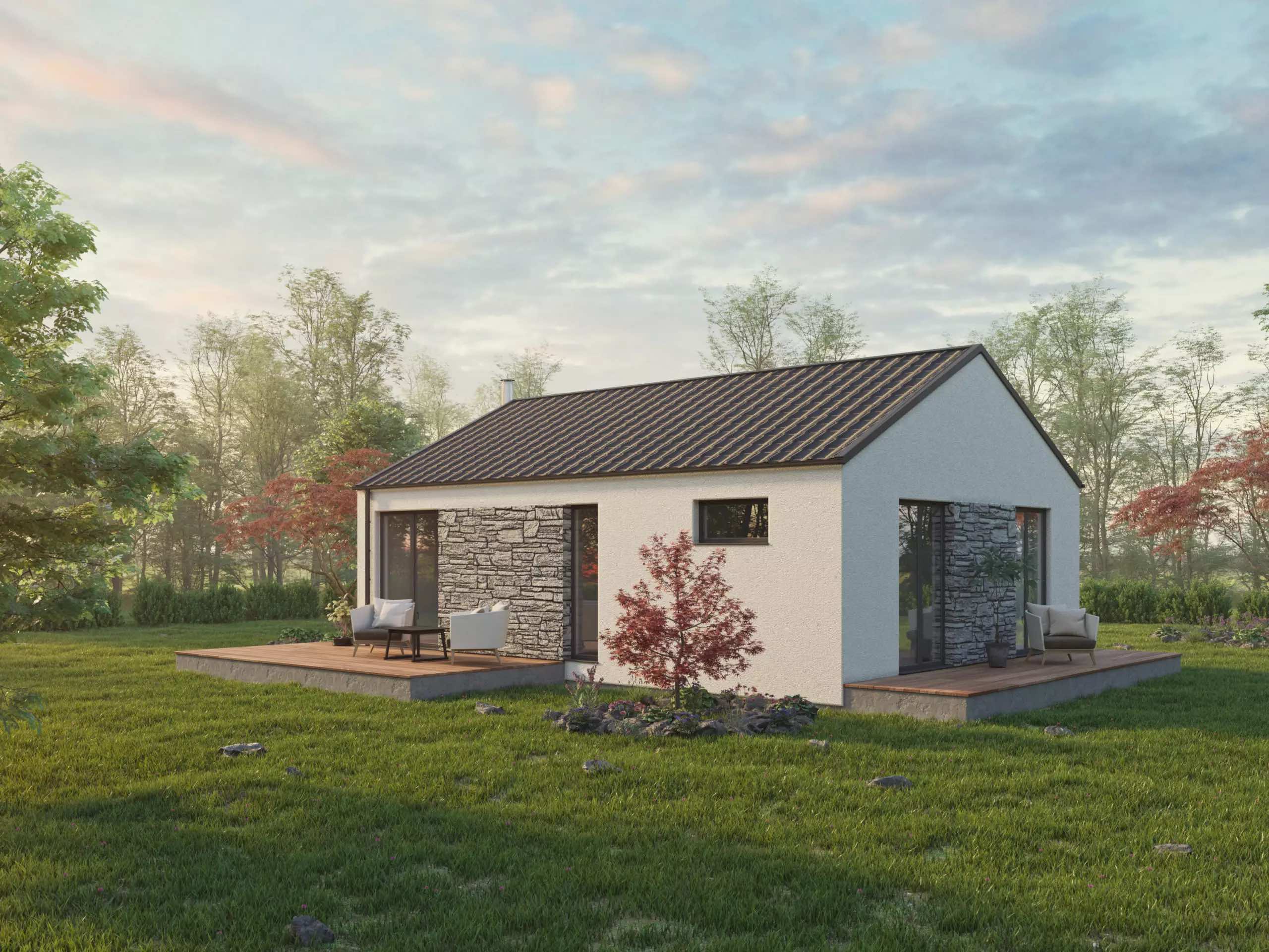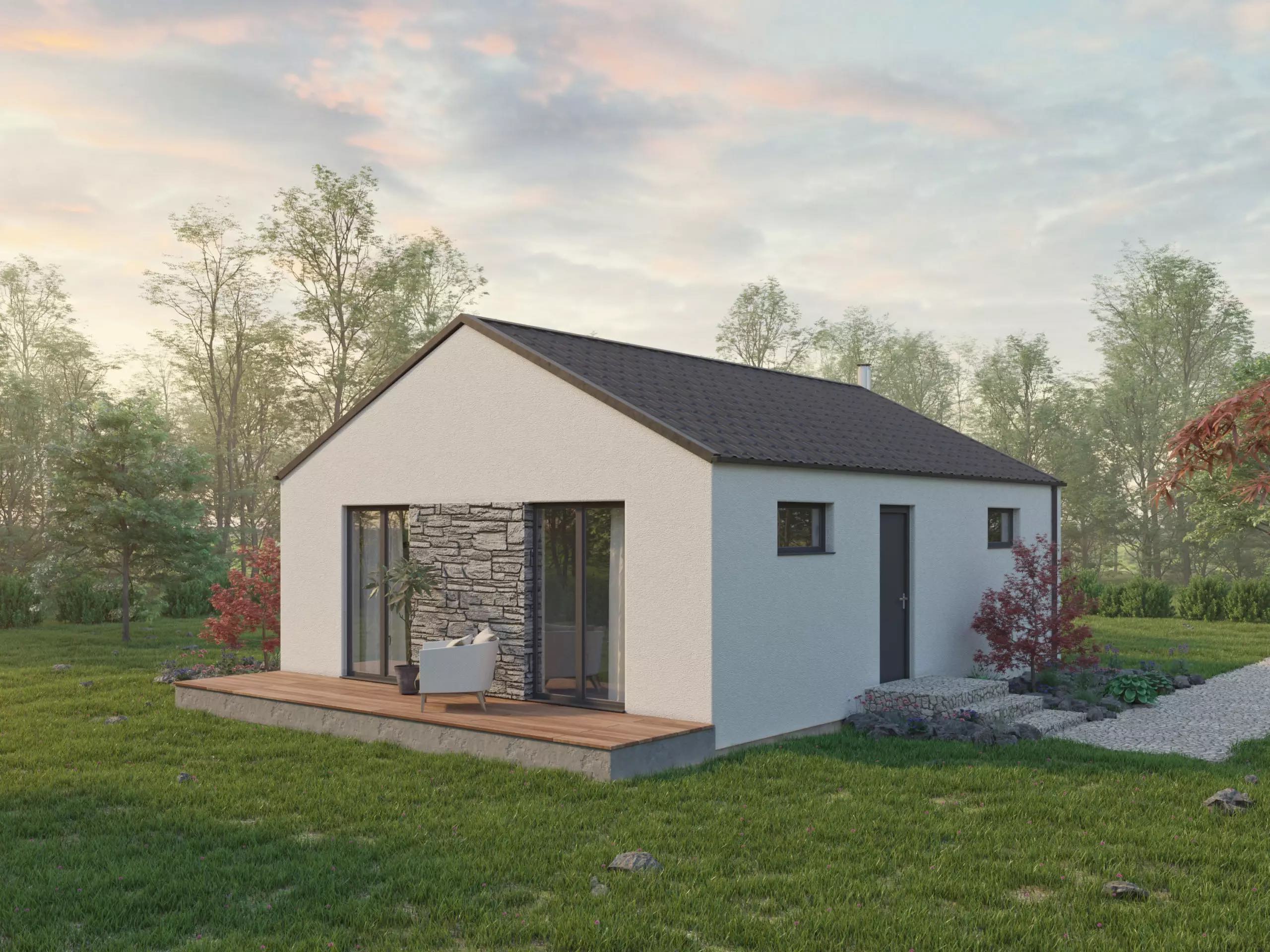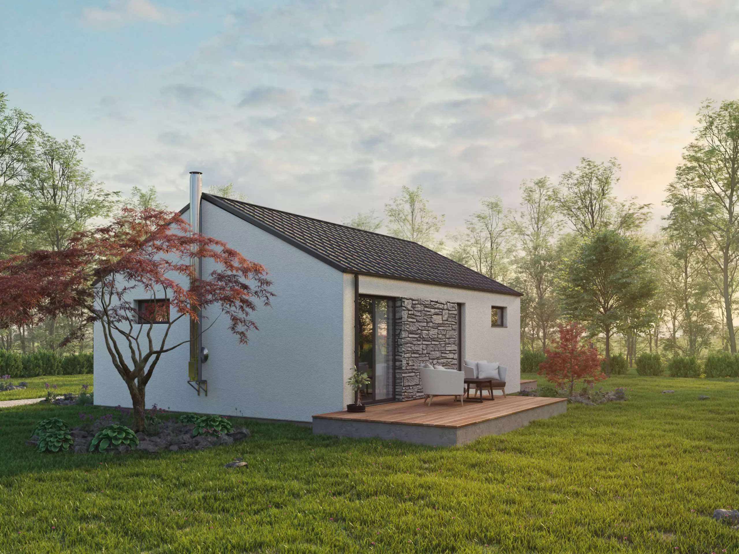 Menší rodinný dům typu bungalov se sedlovou střechou, který má k dispozici dvě solitérní terasy. Moderní vzhled domu podtrhuje částečné obložení fasády kamenným obkladem. Díky své nízké ceně se jedná o jeden z nejdostupnějších domů na klíč.