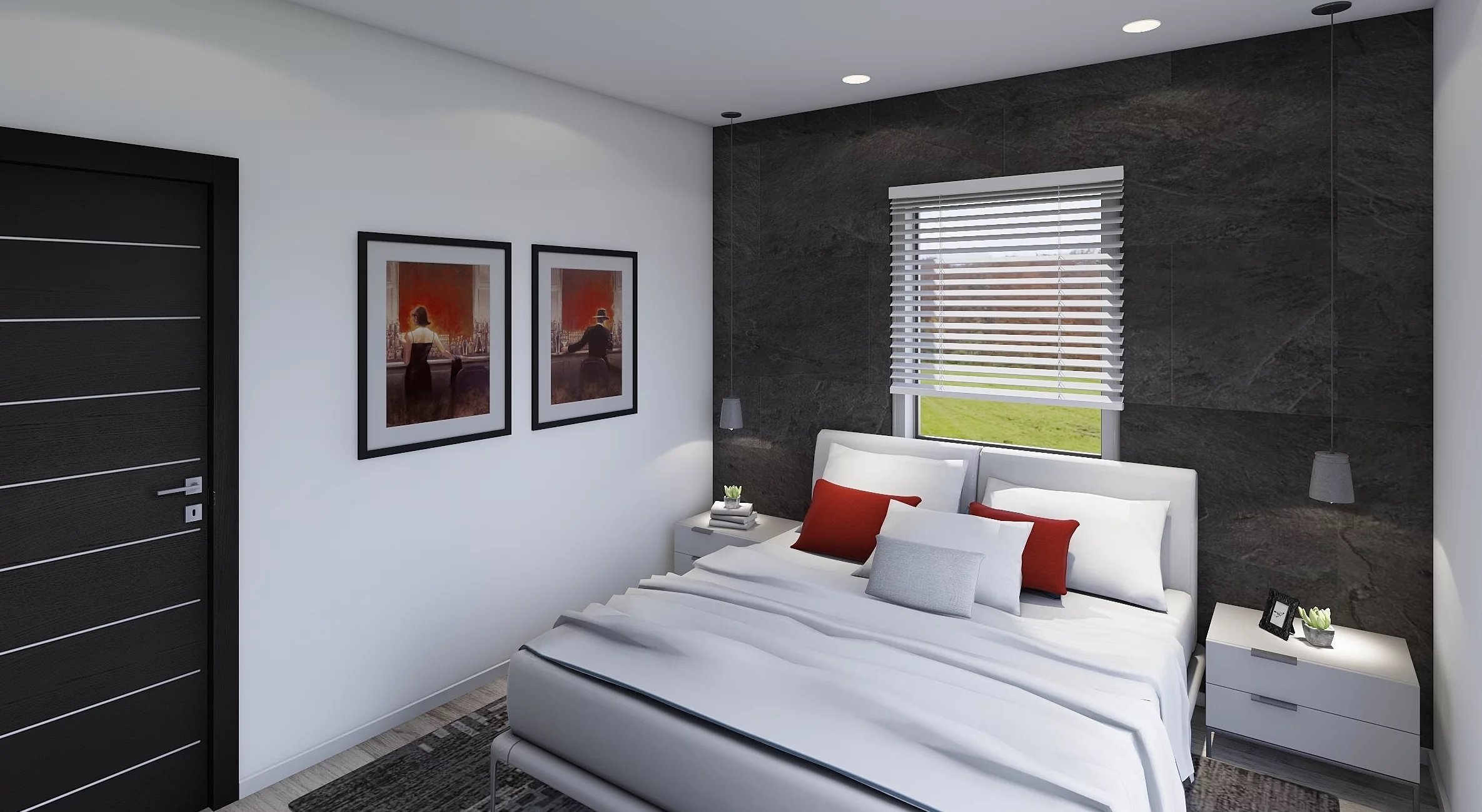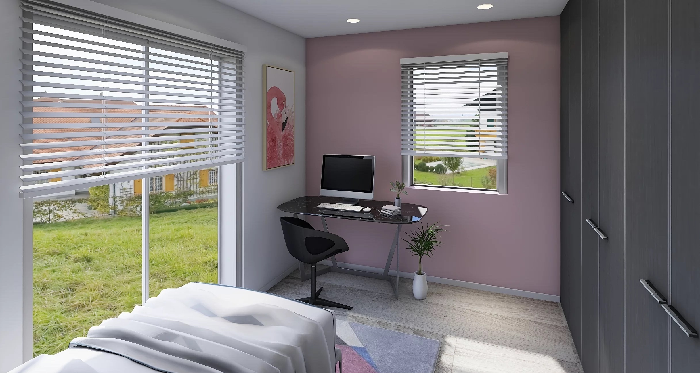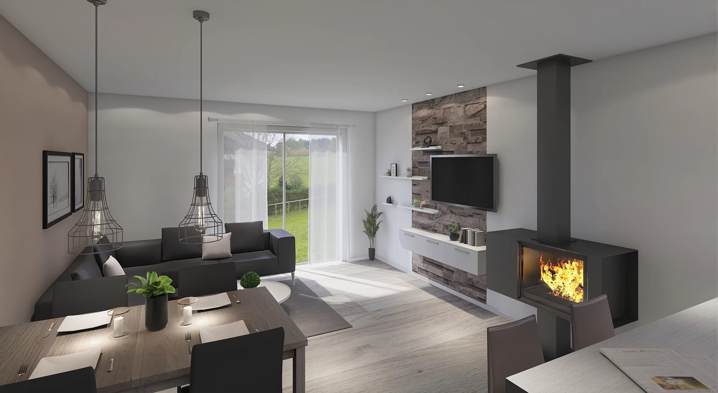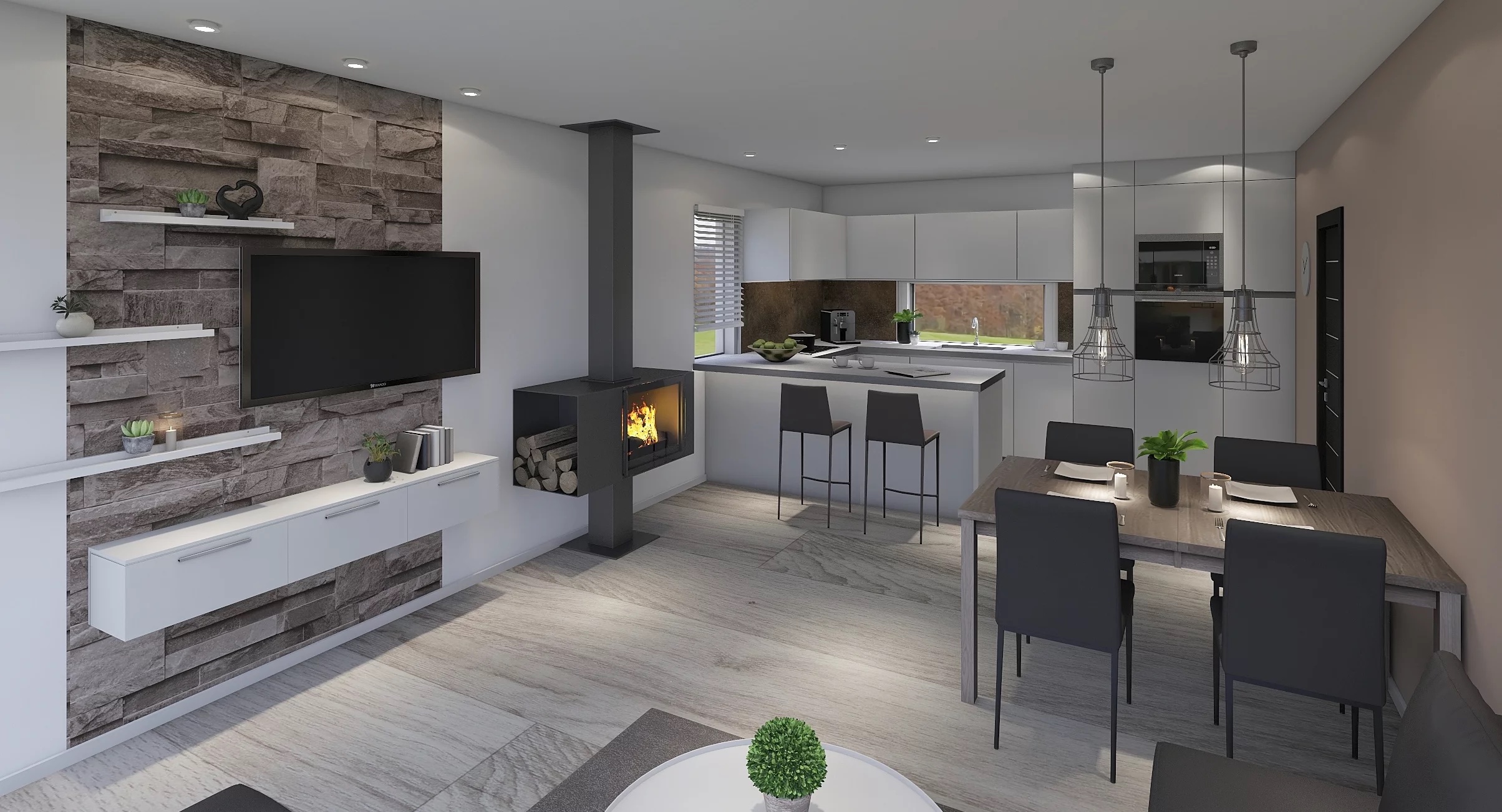 Srdcem domu je obývací pokoj s krbem, spojený s jídelnou a kuchyňským koutem. Dostatečné množství denního světla zajišťuje francouzské okno, které zároveň obývací prostor propojuje s přilehlou terasou a zahradou. Dále se v domě nachází koupelna se sprchovým koutem a 2 ložnice, ze kterých je možné vyjít francouzskými okny na soukromou terasu. V ložnicích je navržen dostatečný prostor pro vestavěné skříně.
