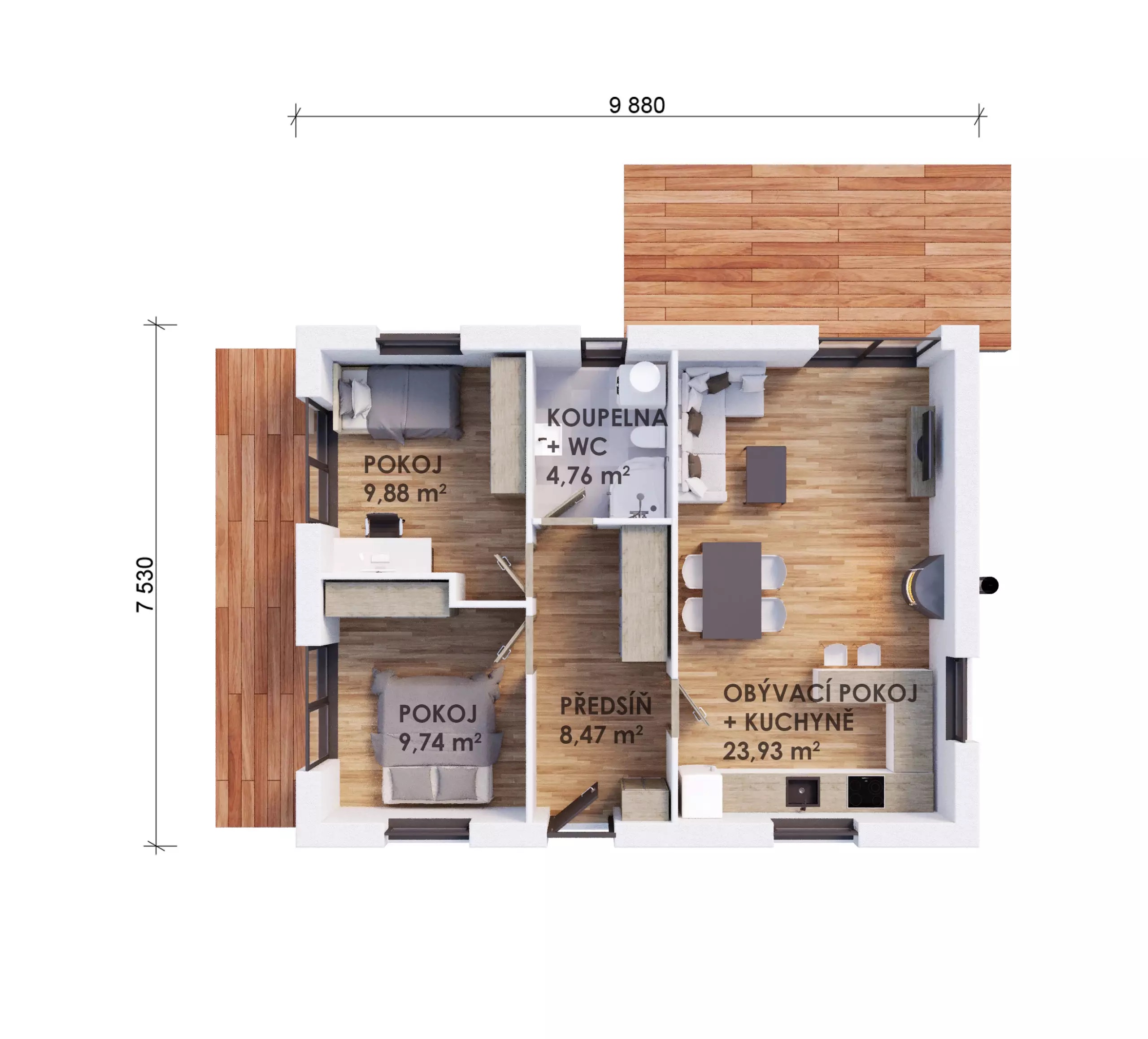 Vnitřní dispozice domu lze upravit na variantu 2+kk.