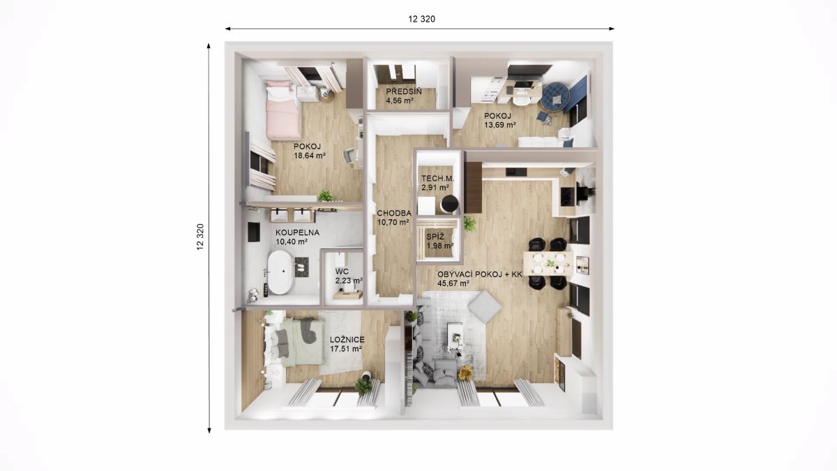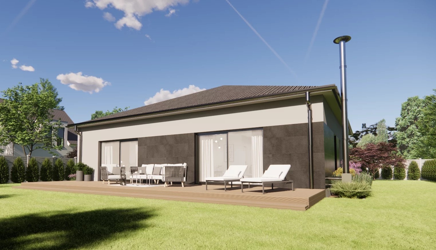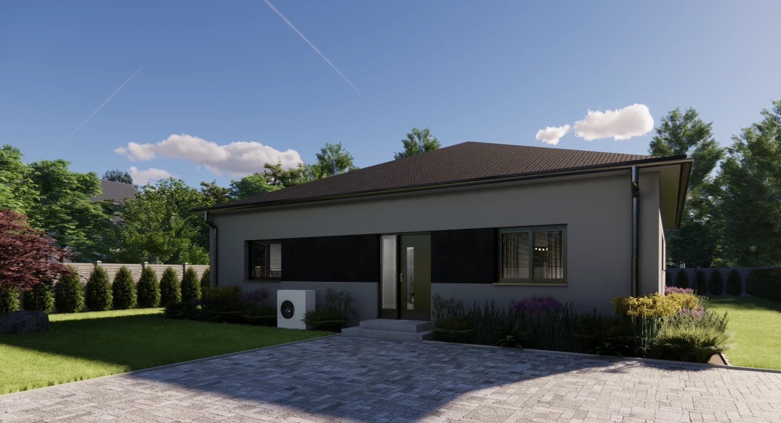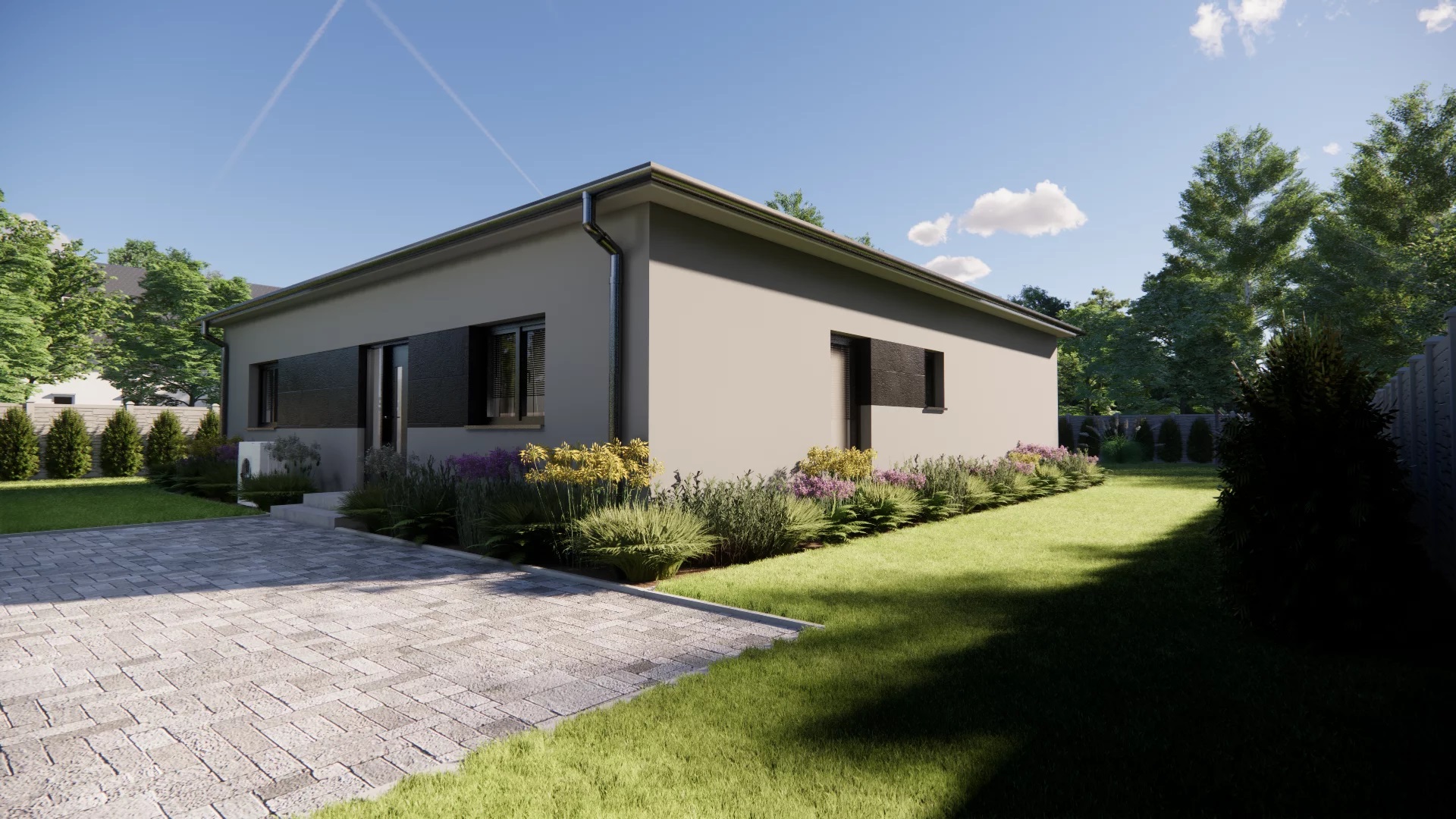 Prostorný, kompaktní, 4pokojový bungalov na čtvercovém půdorysu, ideální pro pohodlné bydlení rodiny se 2-3 dětmi.