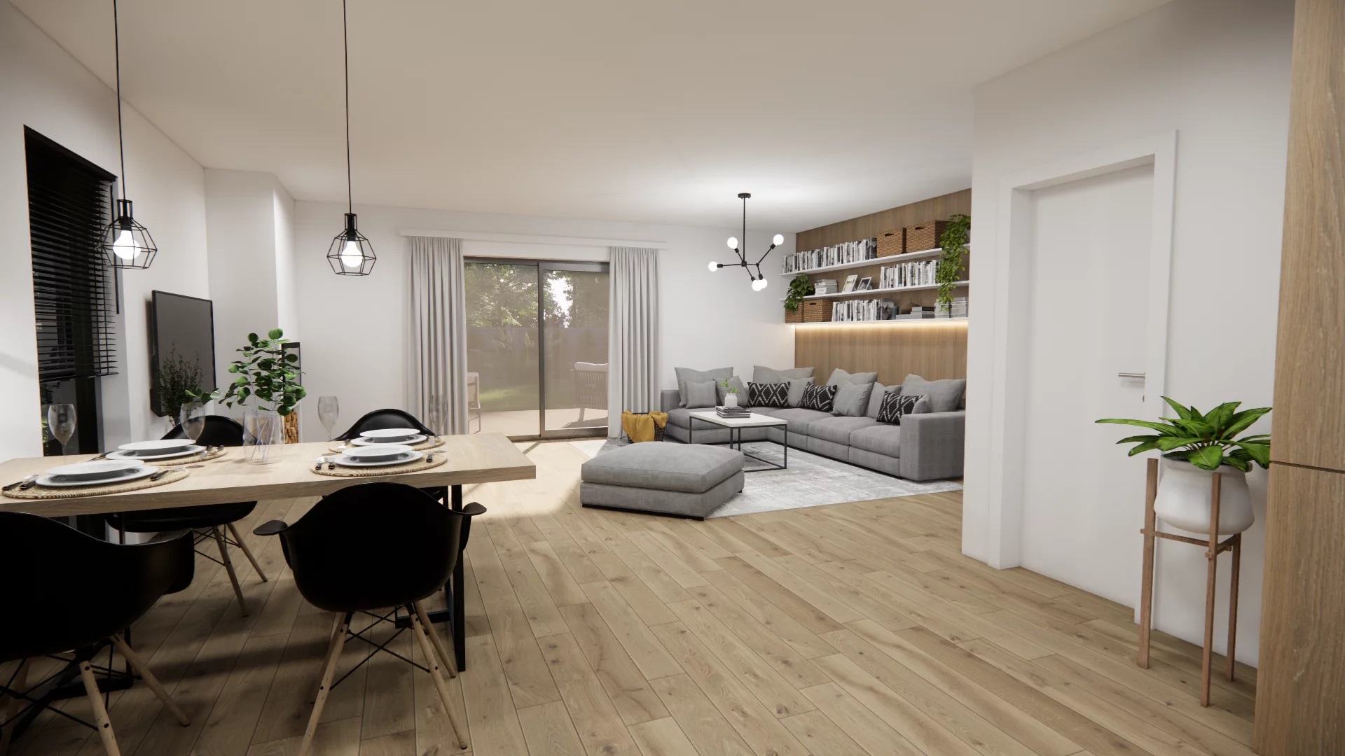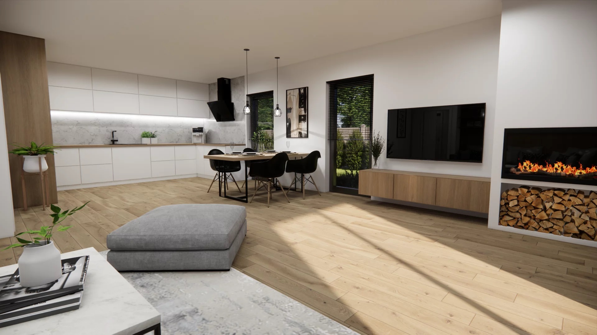 Společenskou část domu tvoří obytný velkoprostor s krbem, propojený s jídelnou a kuchyňským koutem. Nechybí ani spíž pro pohodlné skladování potravin. Bohaté prosklení je zárukou dokonalého prosvětlení interiéru denním světlem a ničím nerušeného výhledu do zahrady.