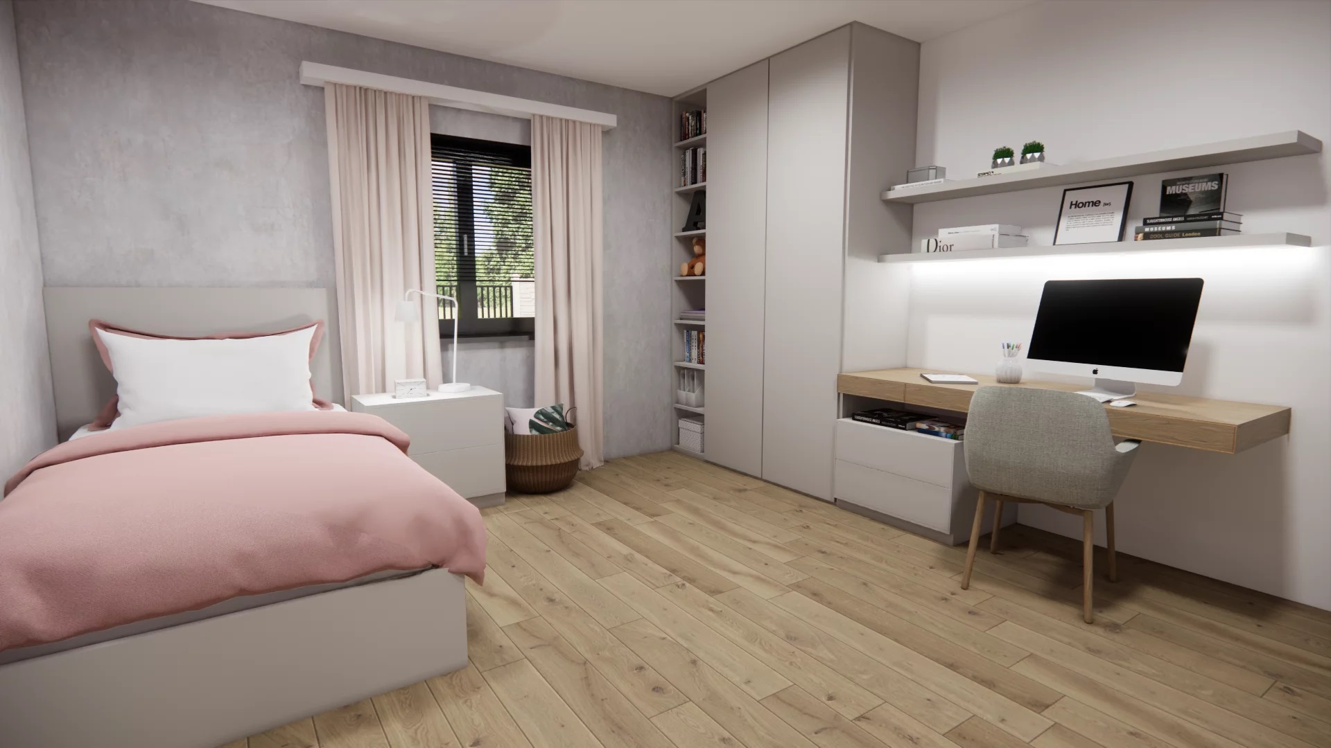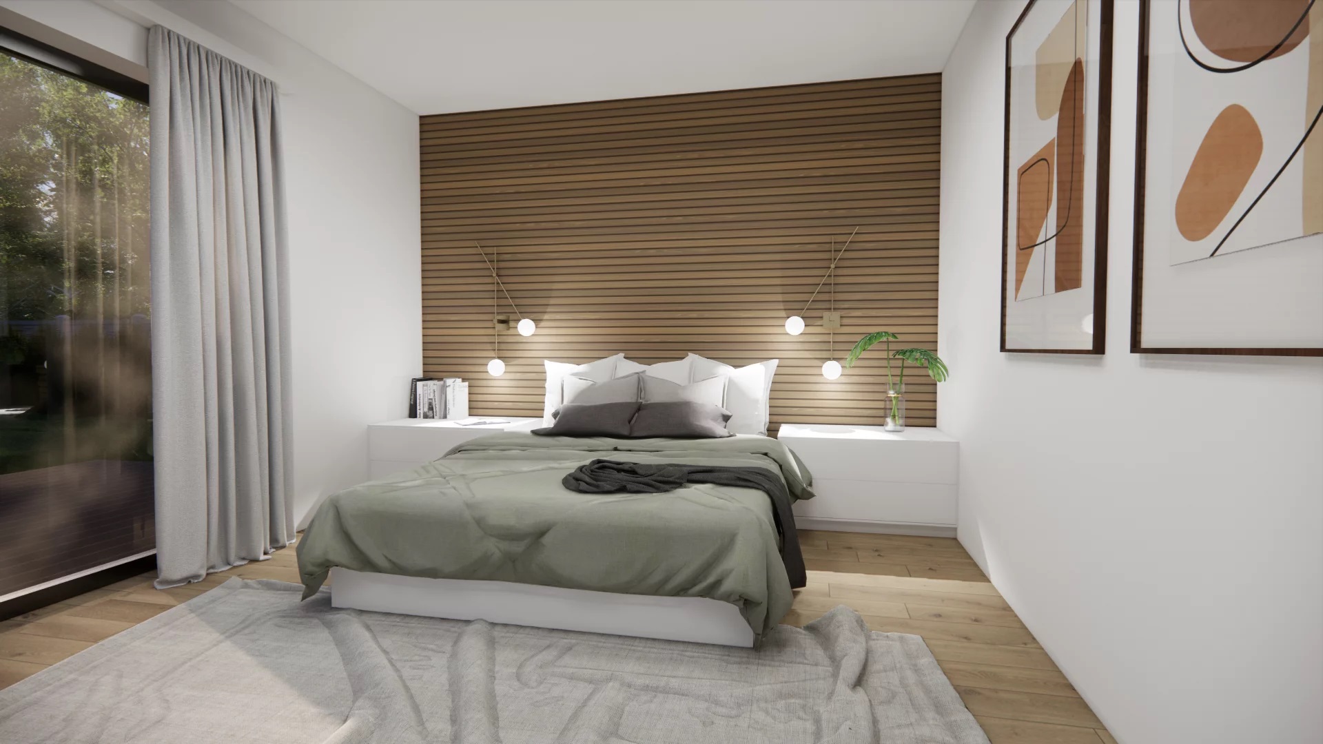 V domě je dále umístěna velkorysá ložnice rodičů s přímým výstupem na terasu, rozlehlá koupelna s vanou, samostatná toaleta a 2 dětské pokoje.