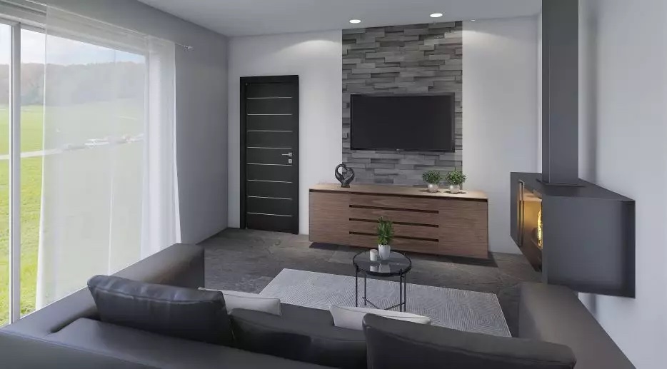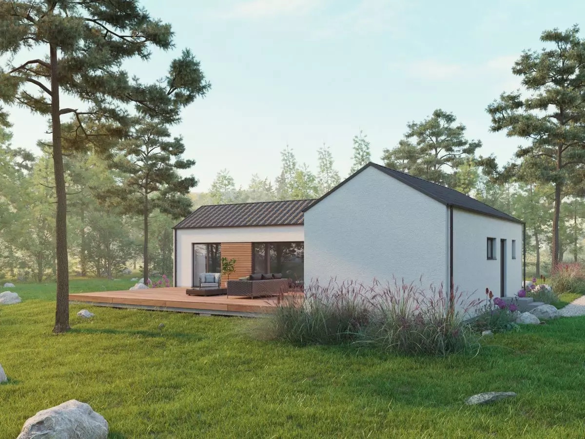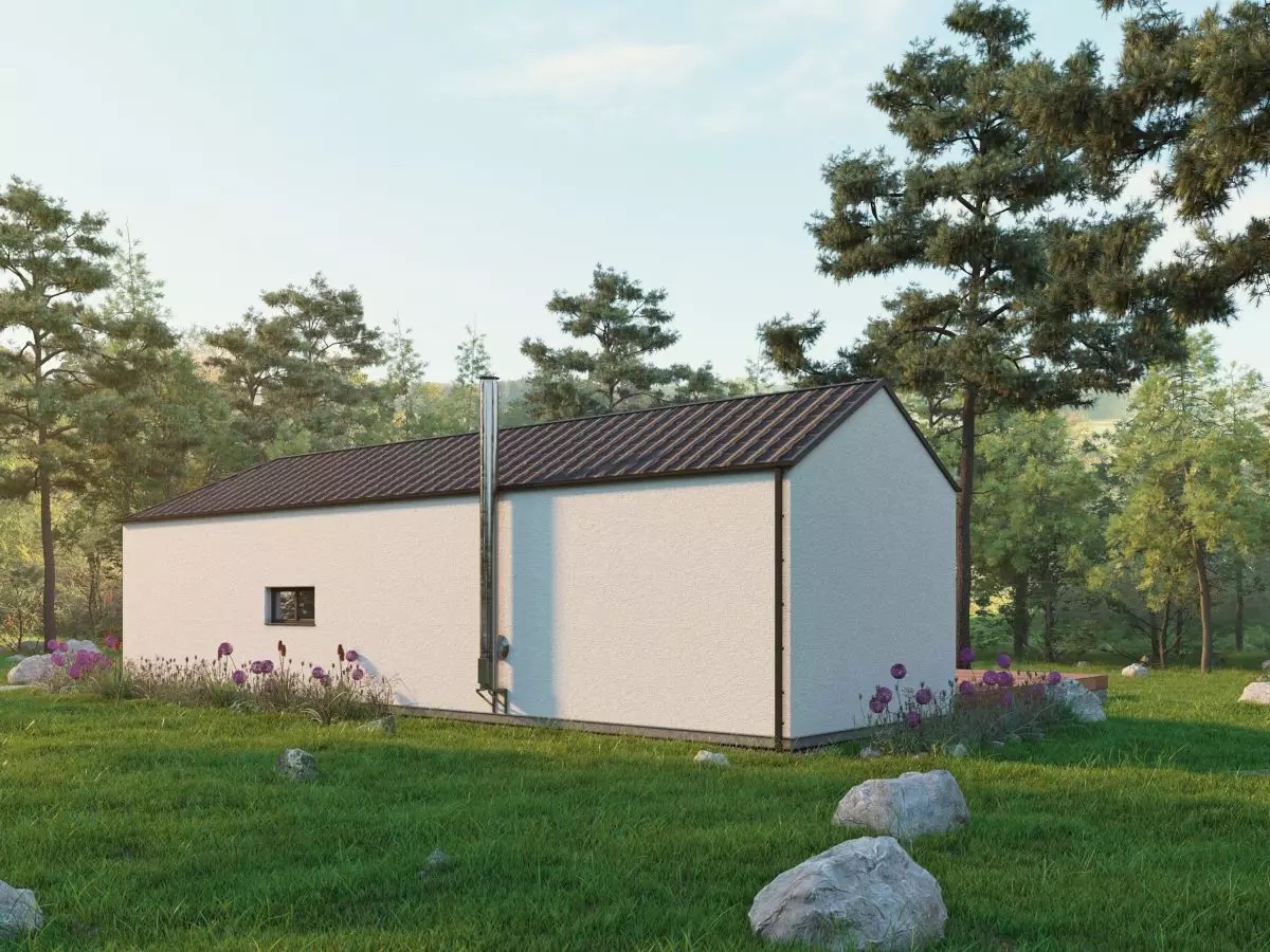 Moderní, jednoduchý bungalov s půdorysem ve tvaru L, který zajistí pocit soukromí na terase. Tato dřevostavba na klíč, i přes svojí menší zastavěnou plochu, nabízí pohodlné bydlení rodině s 1 nebo 2 dětmi.