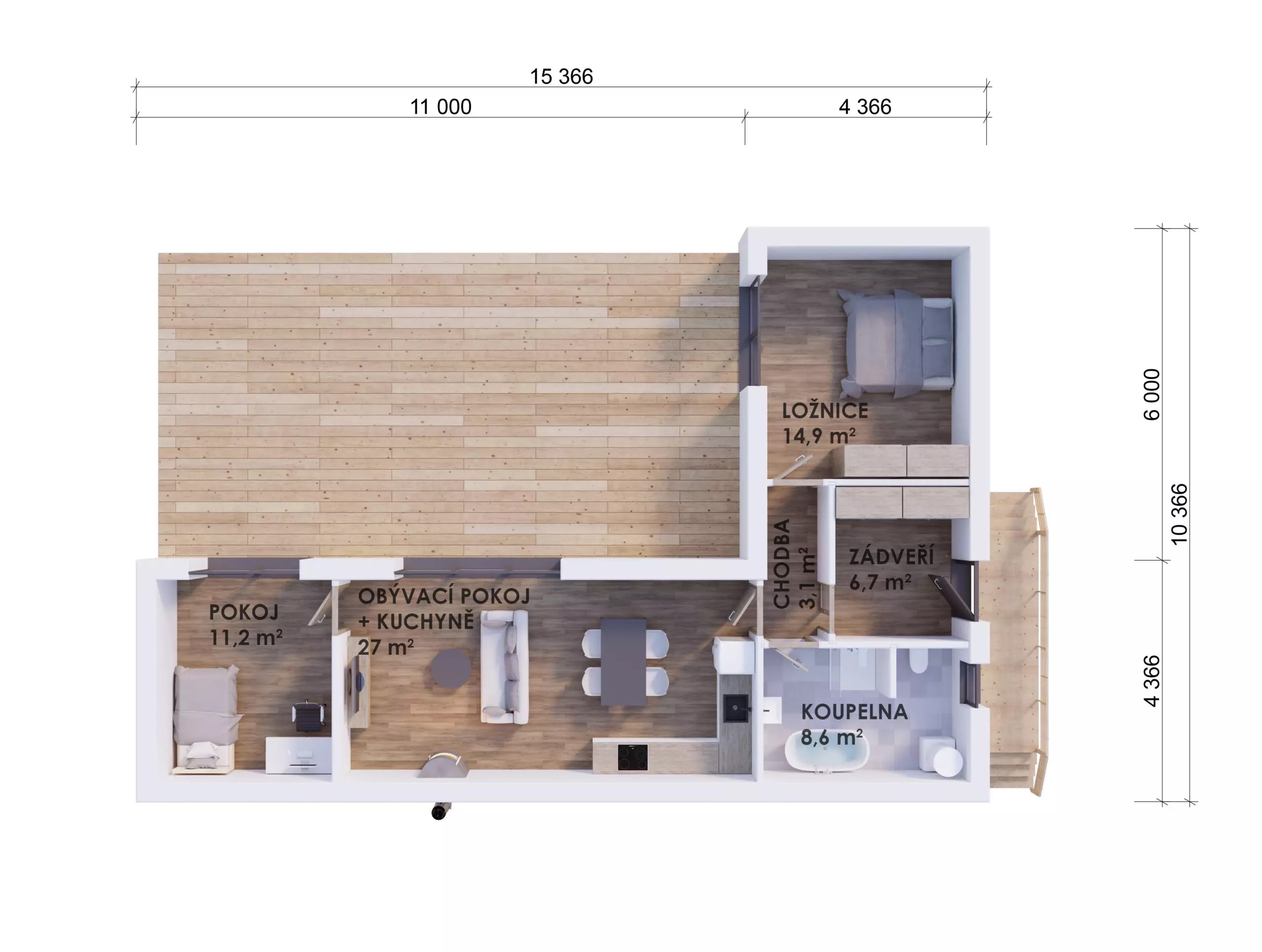 Vnitřní dispozici domu lze upravit na variantu 2+kk.