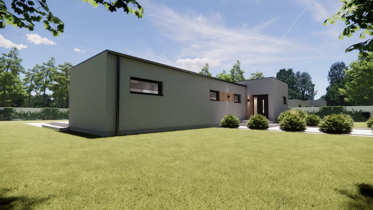 Jednoduchý, minimalistický bungalov s plochou střechou, který svými vnitřními prostory uspokojí nároky na bydlení 4-5členné rodiny. Střecha u tohoto domu alternativně může být i sedlová či pultová.