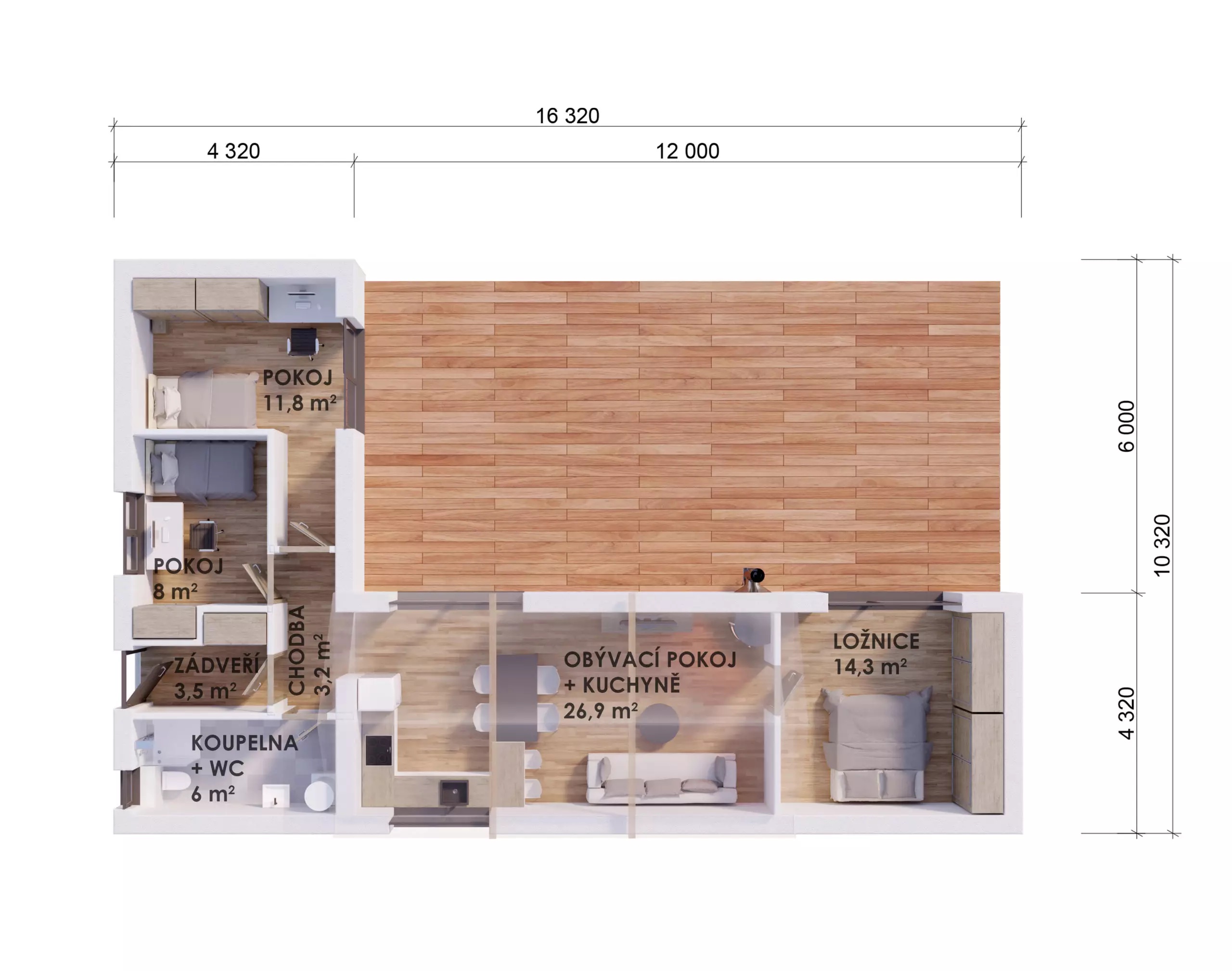 Obývací prostor s jídelnou a kuch. koutem
