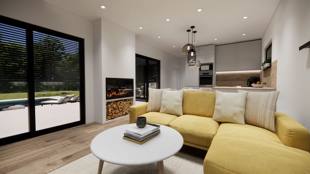 Cena neobsahuje komínový systém a krbovou vložku, žaluzie, kuchyňskou linku ani žádný jiný nábytek, terasu, okapové chodníky, zpevněné plochy na pozemku, přípojky inženýrských sítí, sadové úpravy, oplocení pozemku.