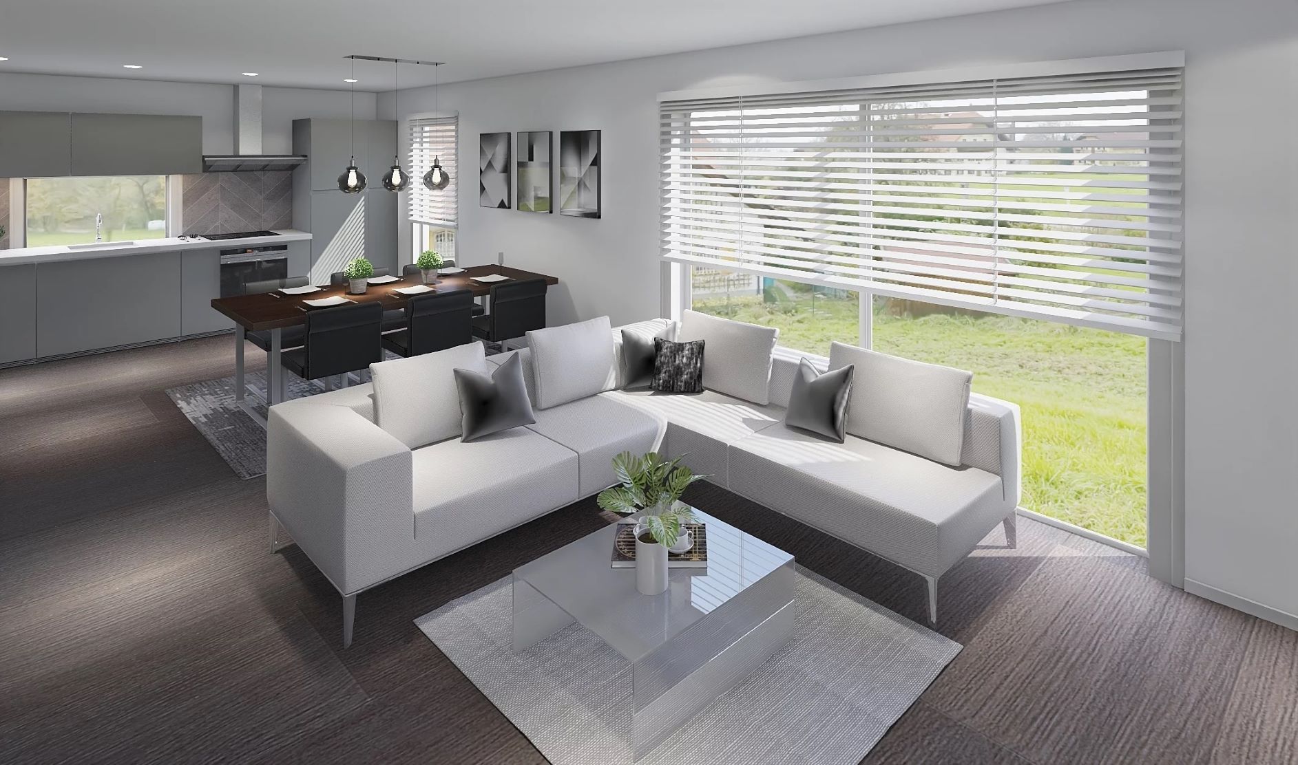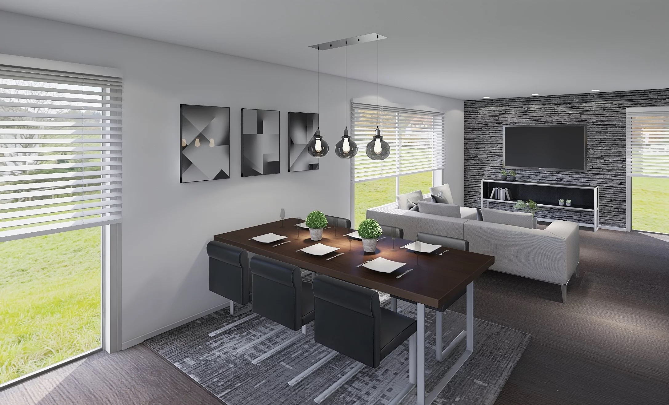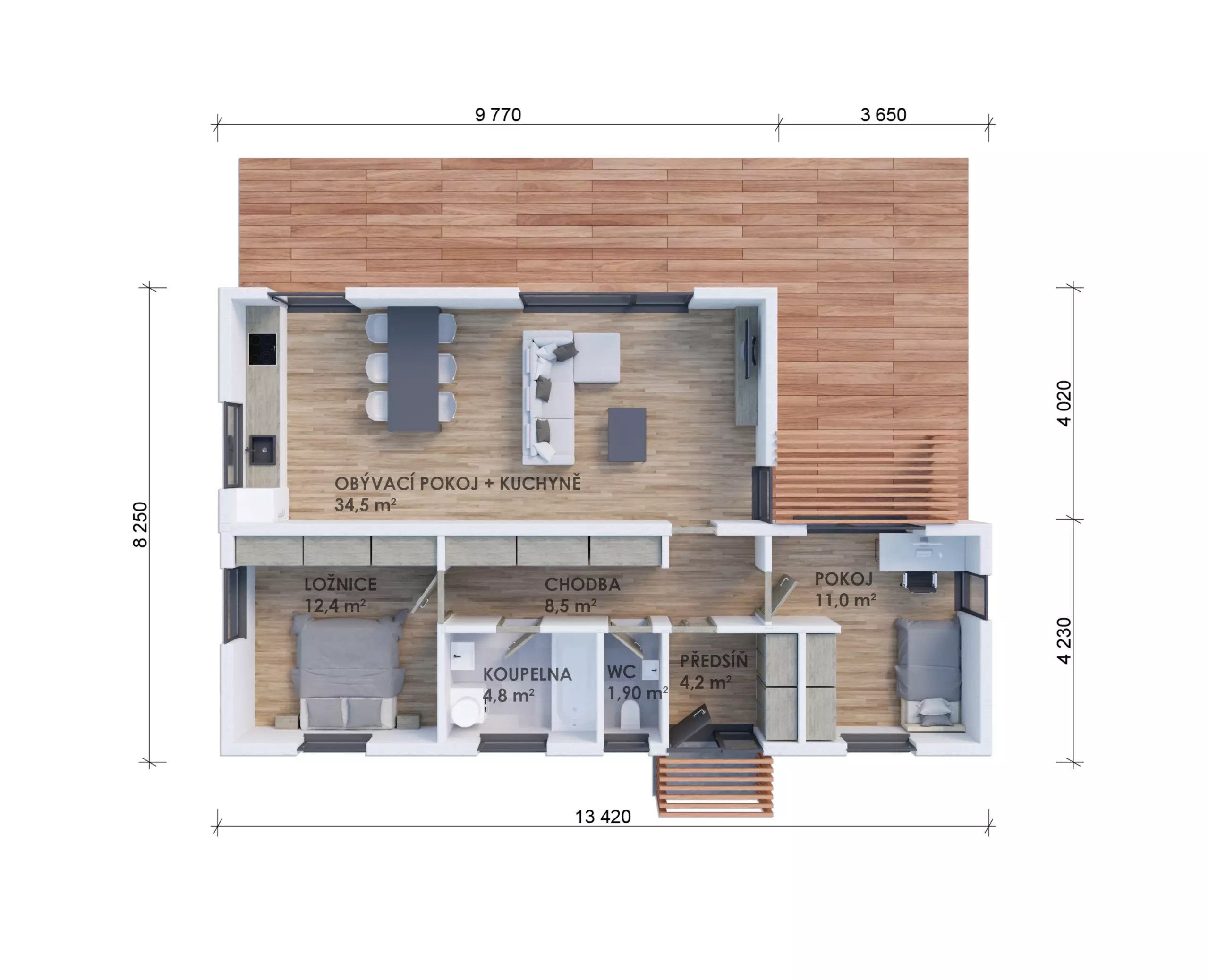 Srdcem domu je obytný prostor, propojený s jídelnou a kuchyňským koutem. Velká francouzská okna zajišťují dostatek denního světla v interiéru a jeho přirozené propojení s terasou.