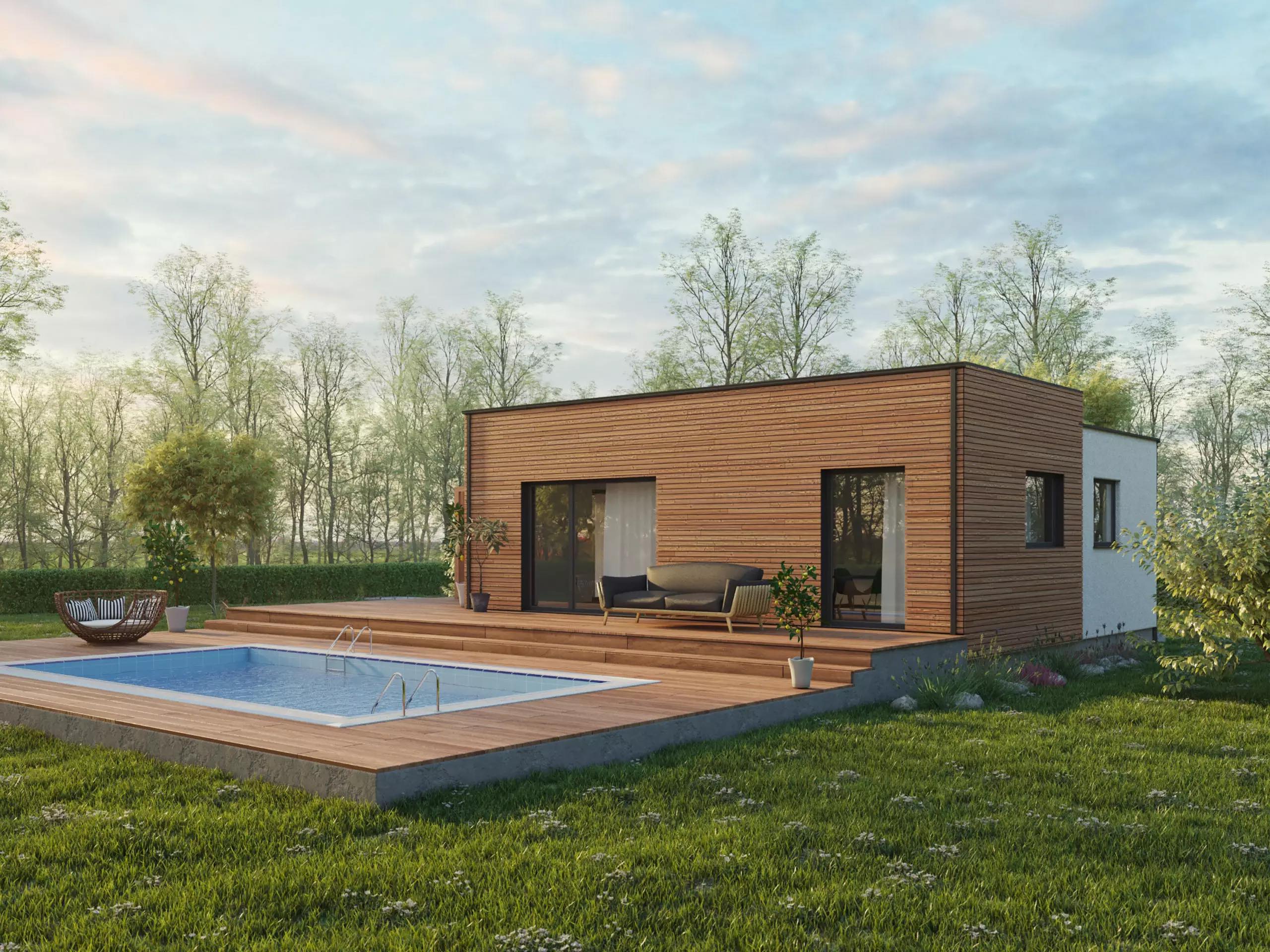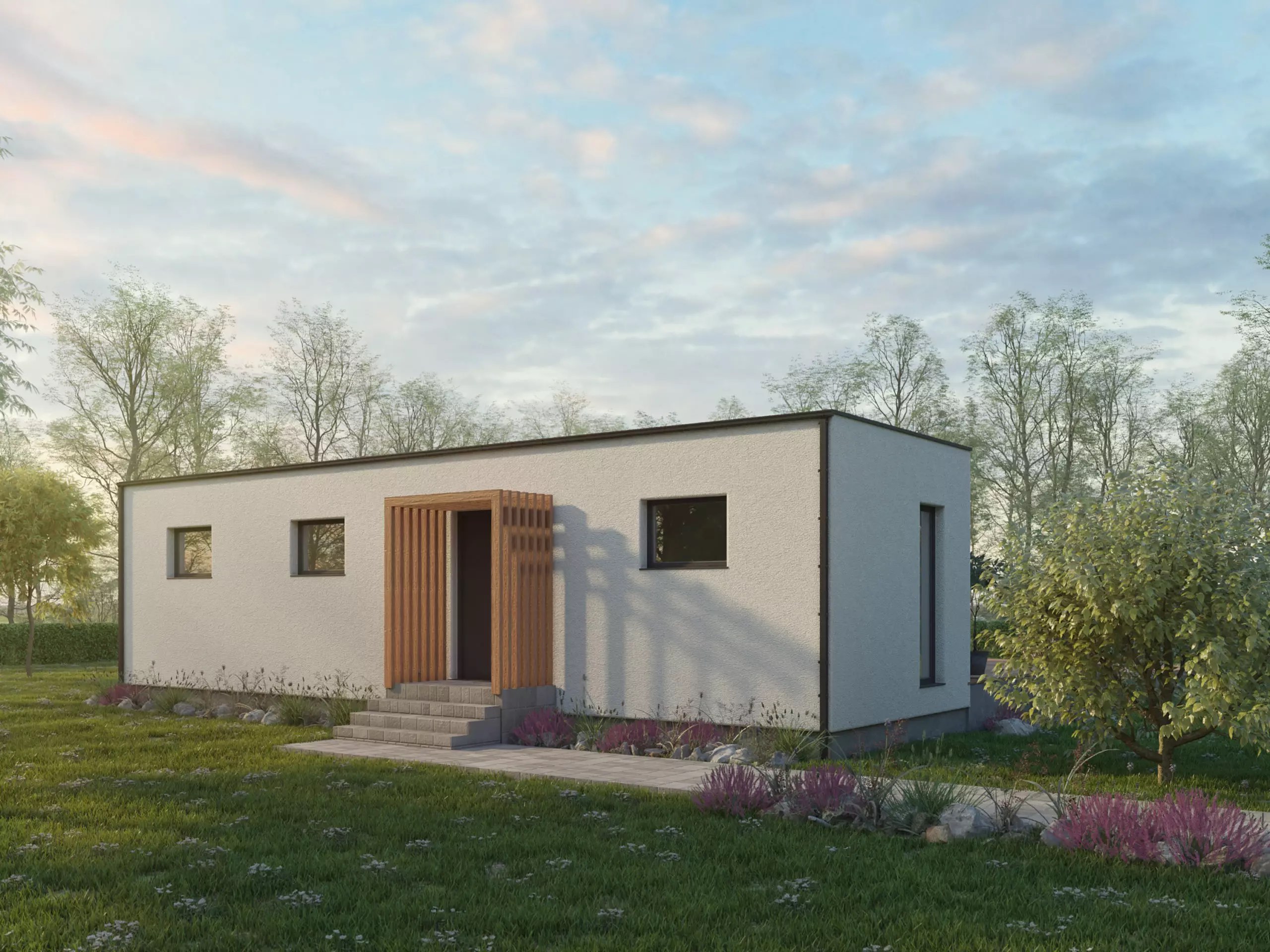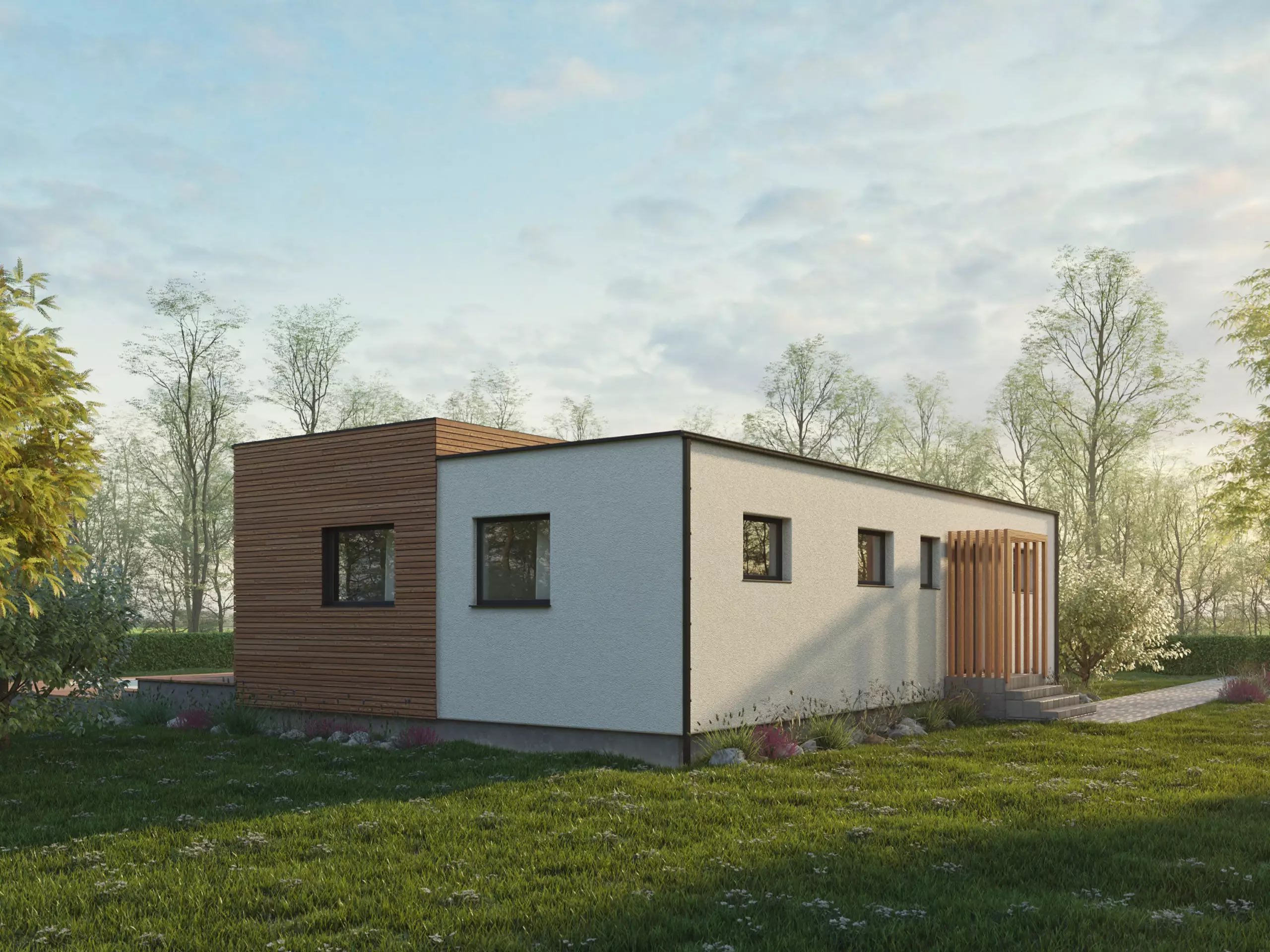 Komfortní bungalov s jednoduchými liniemi, krytým vstupem a plochou střechou. Dřevěný obklad na části fasády vytváří zajímavý a elegantní vzhled domu. Střecha u tohoto domu alternativně může být i pultová.