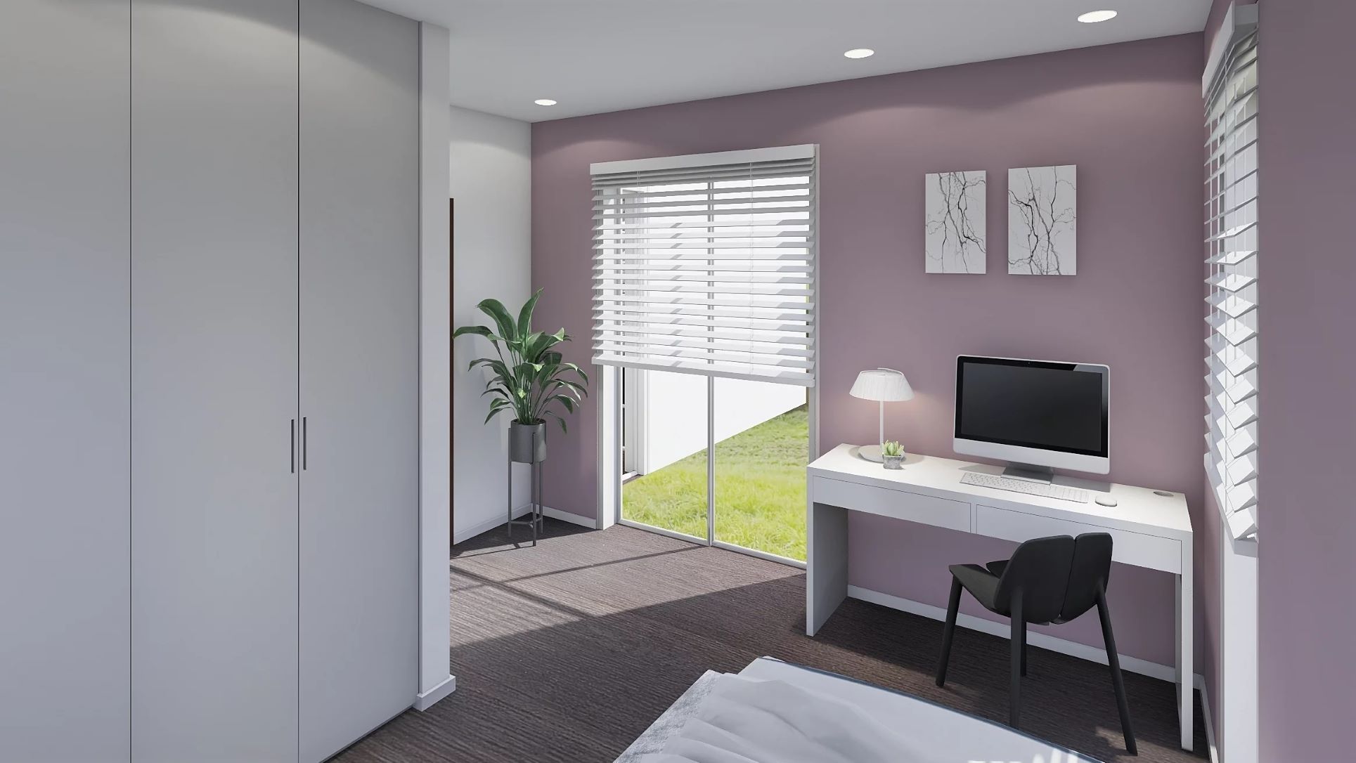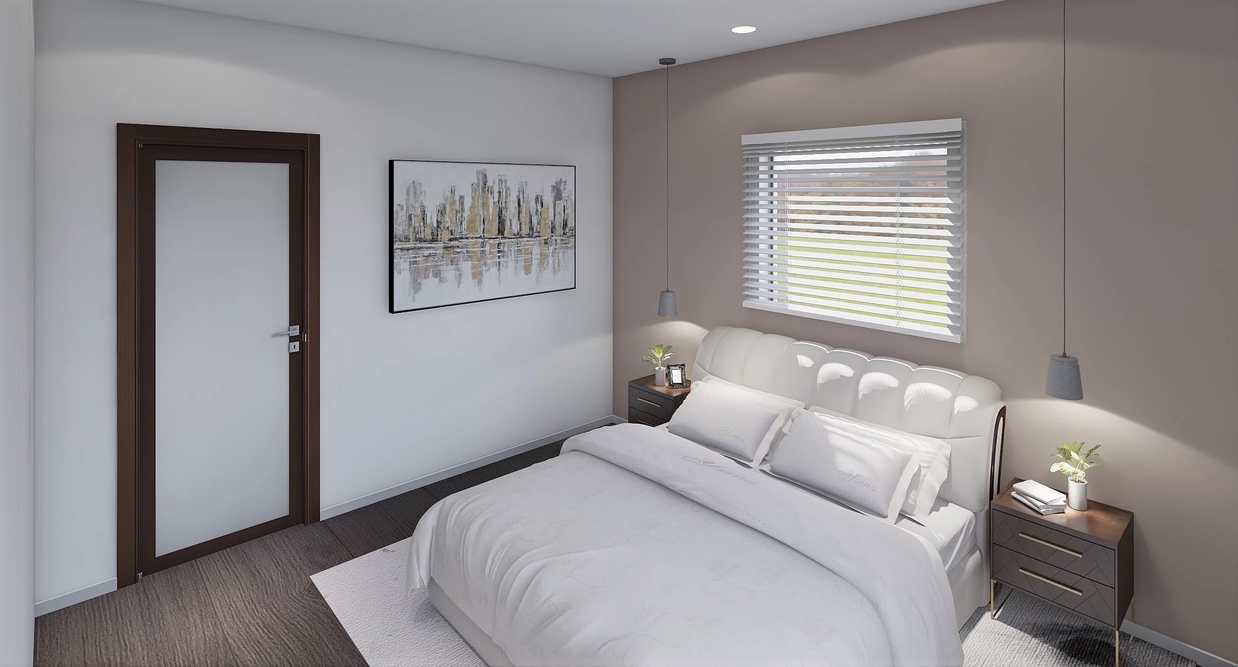 V privátní části domu se nachází ložnice a dětský pokoj se vstupem na terasu. Dále zde najdeme koupelnu s vanou a samostatné wc. V domě je navrženo dostatek prostoru pro vestavěné skříně.