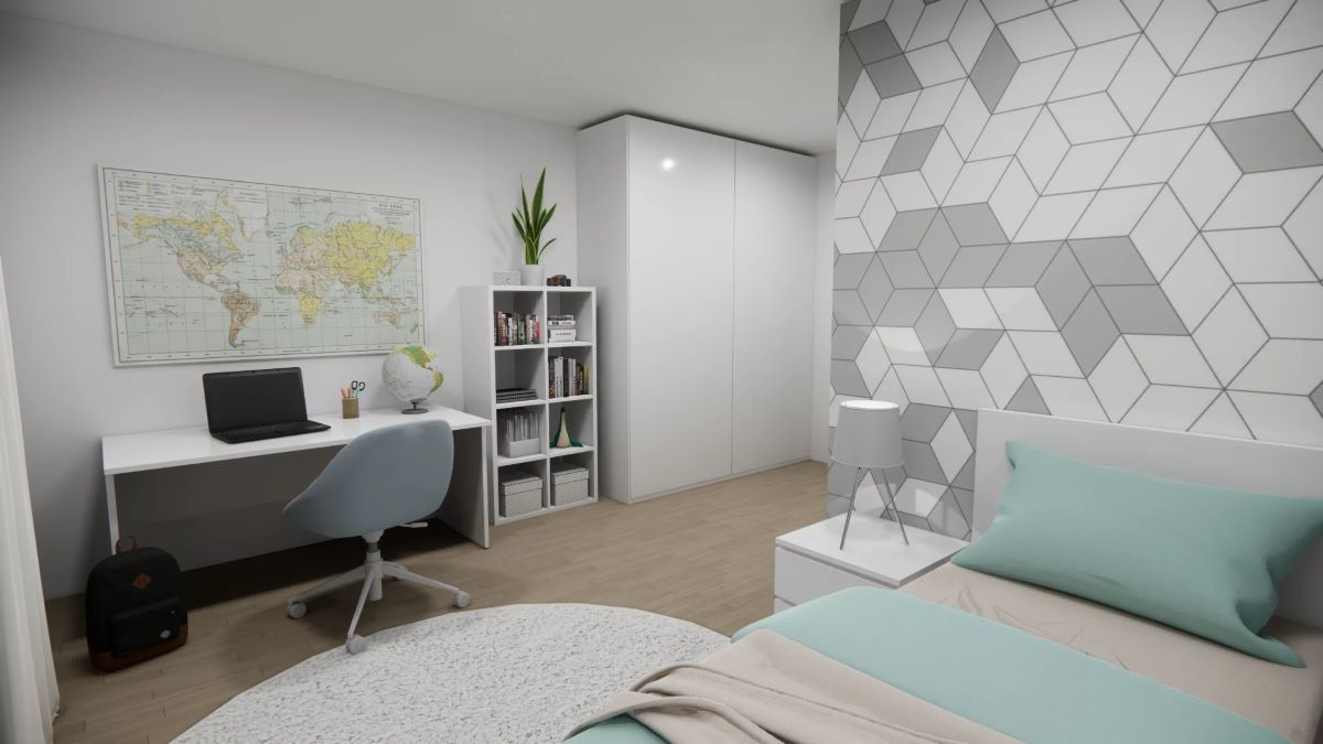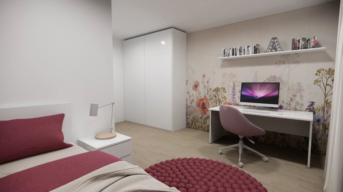 Hned vedle zádveří je navržen pokoj, který podle potřeby může sloužit jako pokoj pro hosty, pracovna, dětský pokoj nebo třeba hobby místnost.