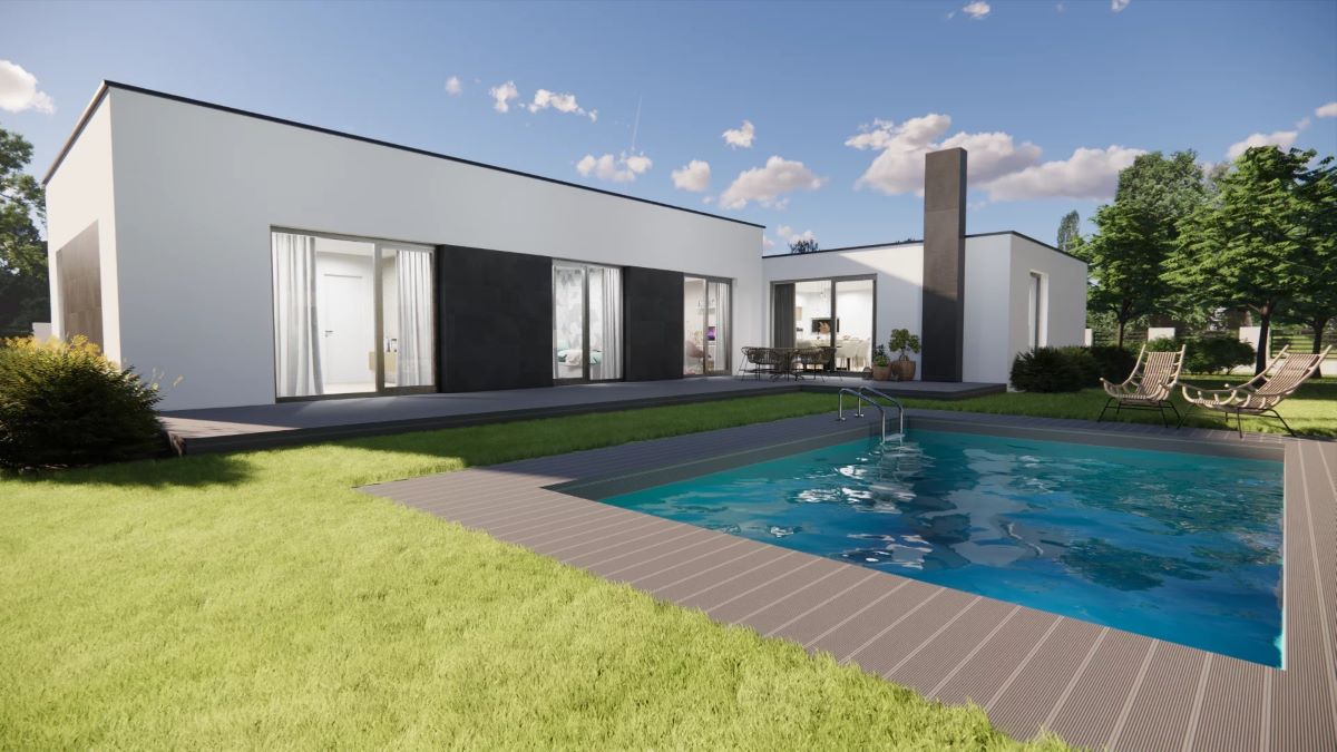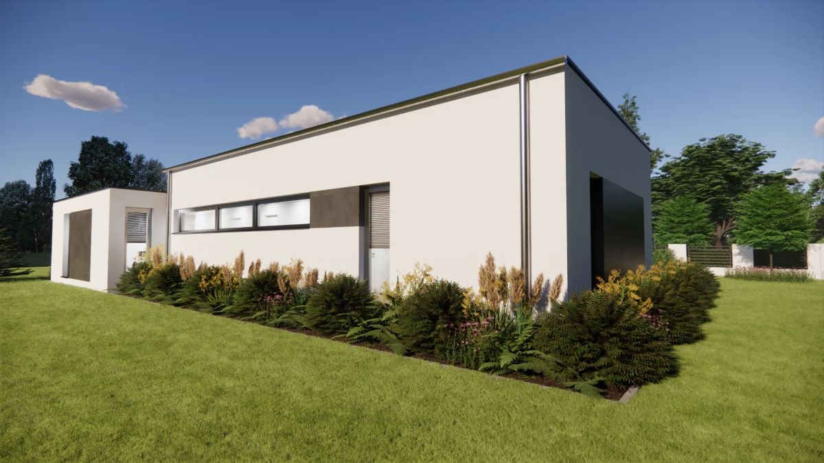 Nadčasový, elegantní 5pokojový rodinný dům s plochou střechou. Charakteristickým prvkem domu jsou velké prosklené plochy, které zabezpečují dokonalé prosvětlení interiéru denním světlem v kteroukoliv denní dobu.