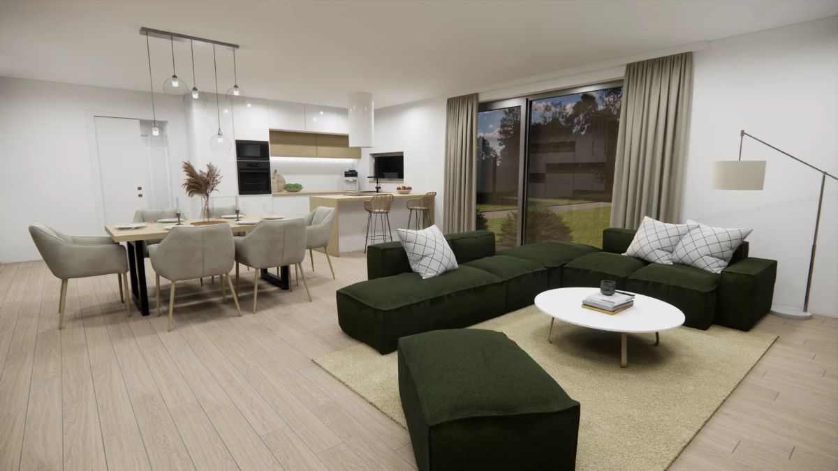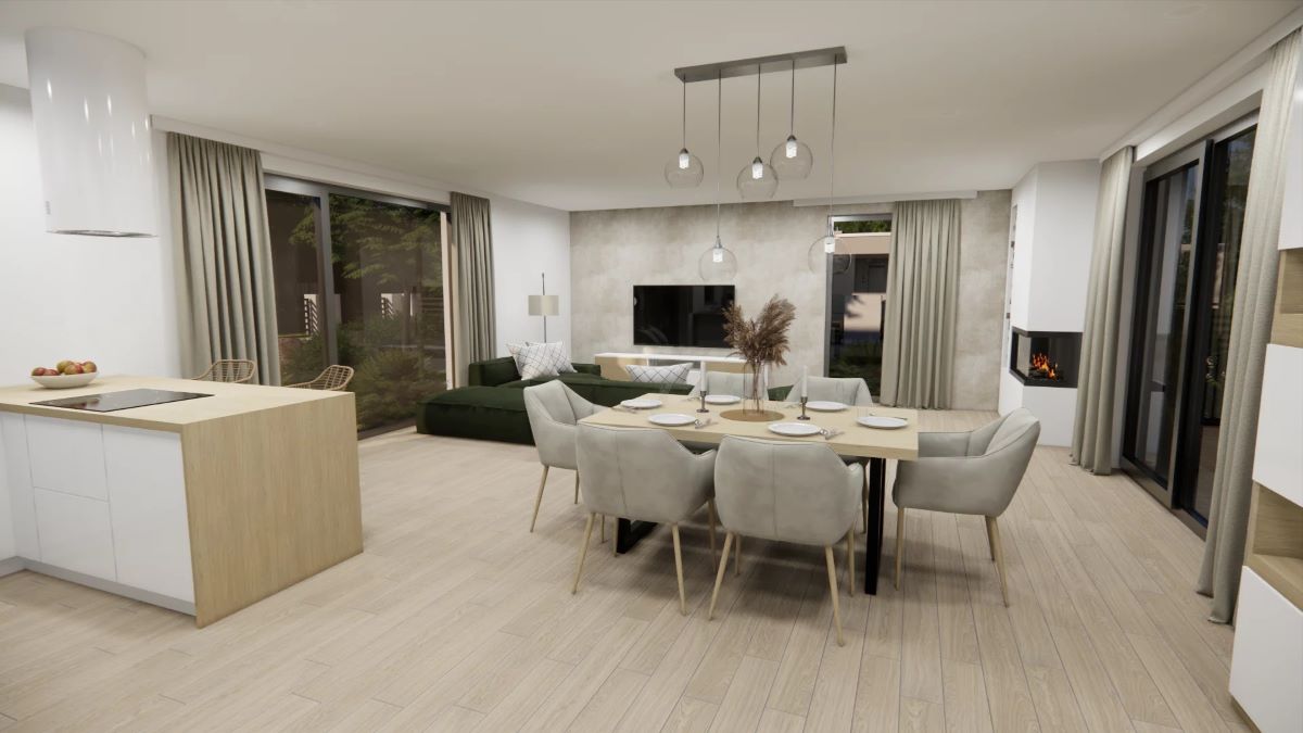Srdcem domu je obytný velkoprostor s krbem, propojený s jídelnou a kuchyňským koutem. Velká francouzská okna na 3 stranách zajišťují kromě dostatku denního světla také přirozené propojení interiéru s terasou a ničím nerušený výhled do zahrady.