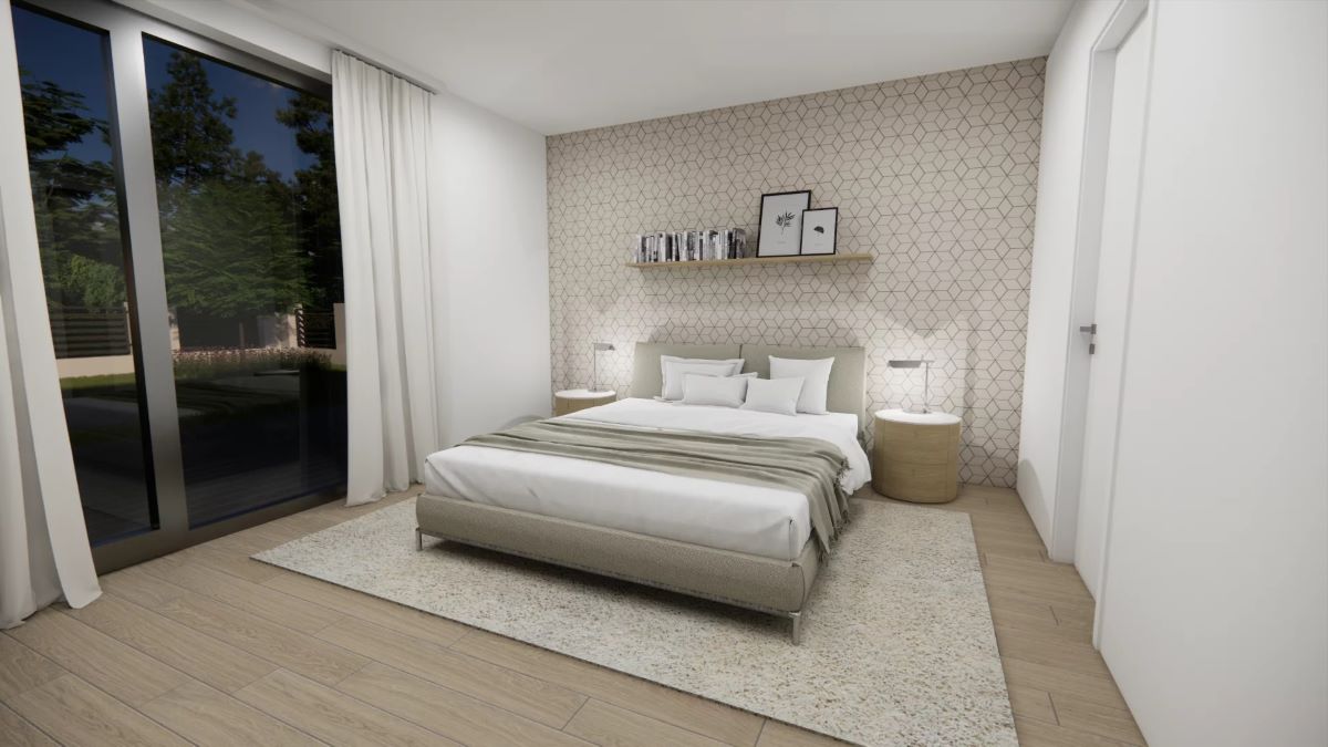 V privátní části domu je umístěna velkorysá ložnice rodičů s vlastní koupelnou a šatnou. Dále 2 dětské pokoje a nadstandardně velká koupelna s vanou i sprchovým koutem.