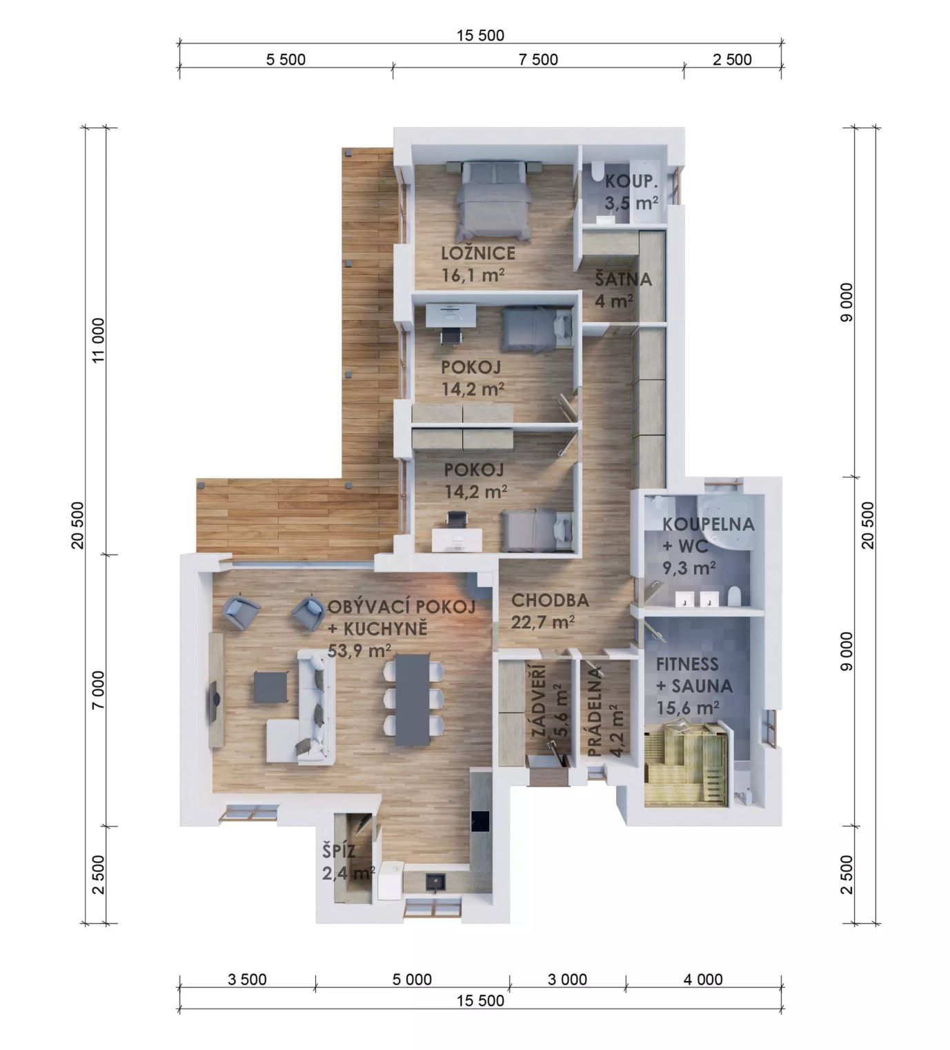 Samostatná spíž, Samostatná šatna, Hlavní ložnice s vlastní koupelnou, Pracovna, Pokoj pro hosty, Hobby místnost, Krb, Sauna, Terasa