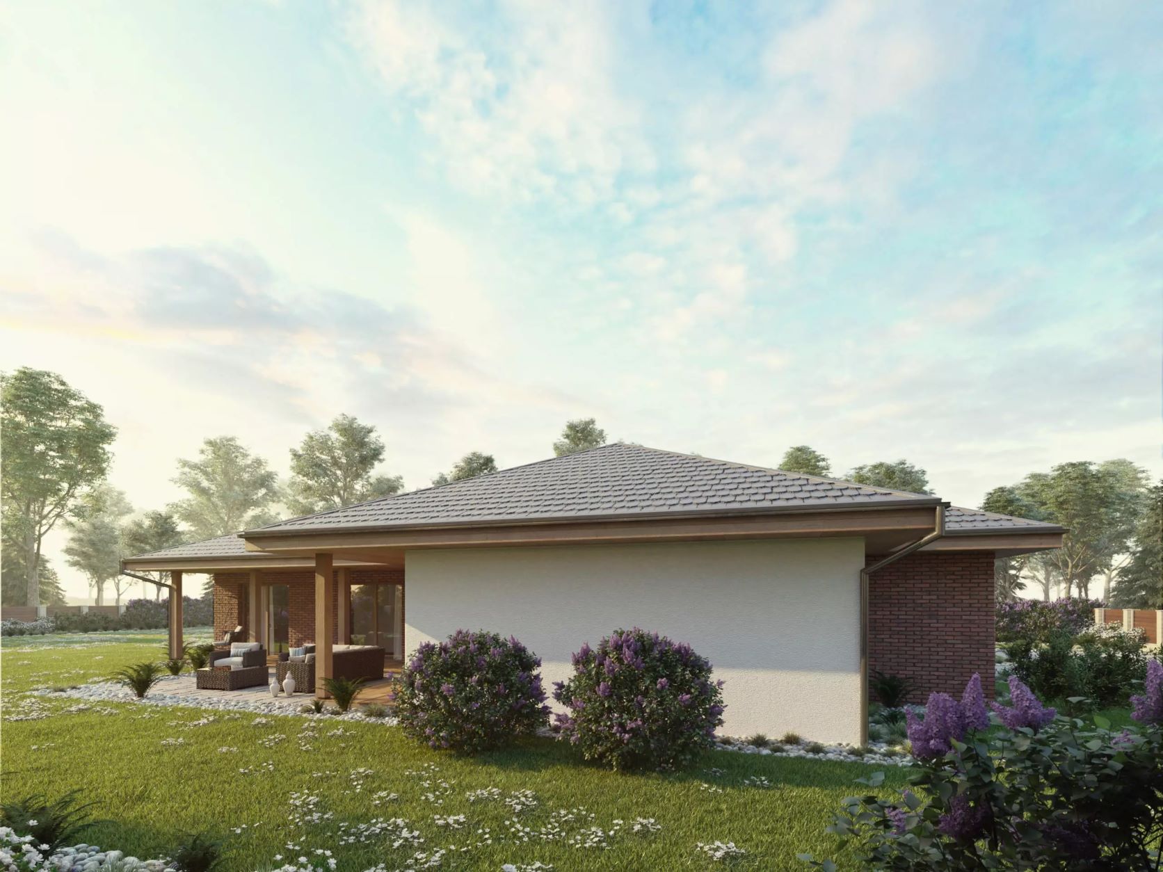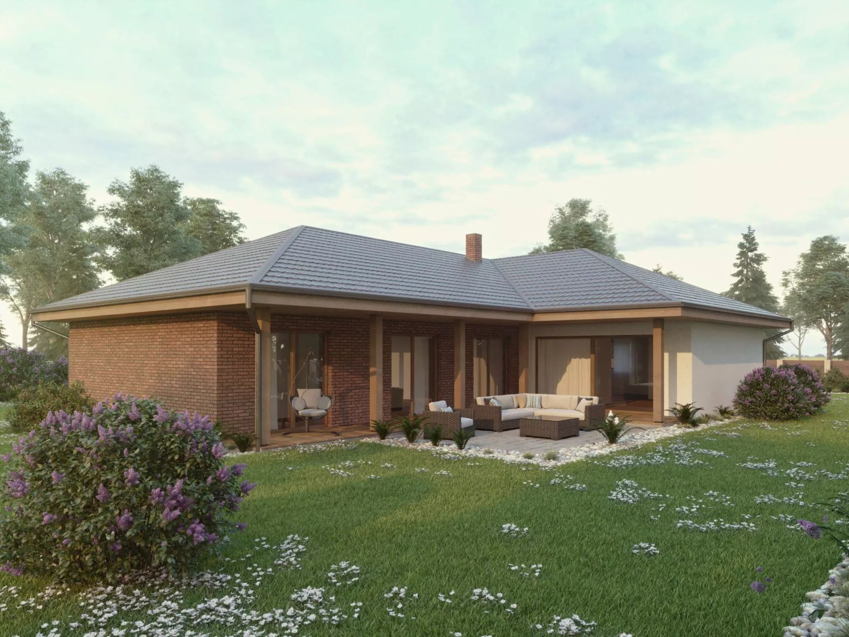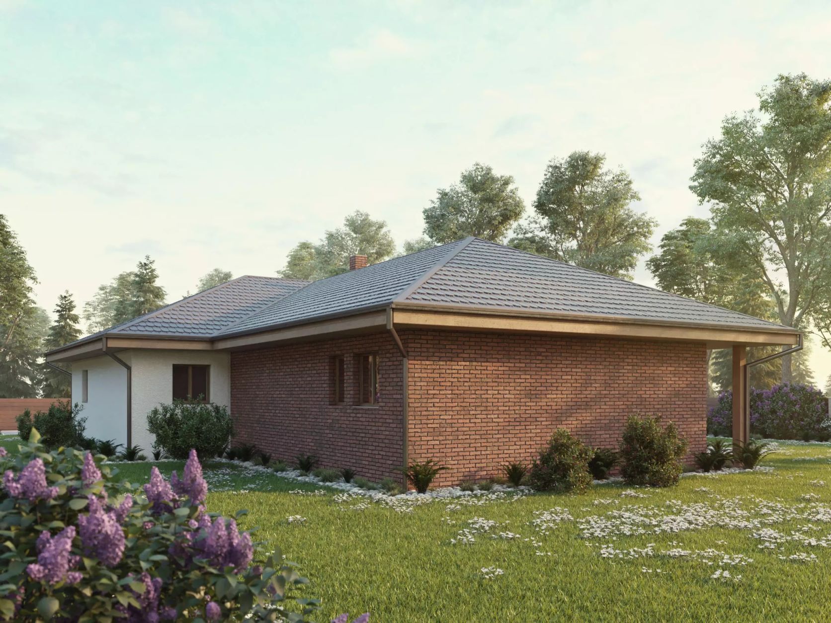 Moderní 5pokojový rodinný dům typu bungalov na půdorysu ve tvaru L, což zajišťuje dokonalé soukromí na terase a výstup na ni ze všech pokojů. Vstup do domu i terasa jsou chráněny přesahem střechy. Použití cihlového obkladu na části fasády dodává domu atraktivní vzhled.