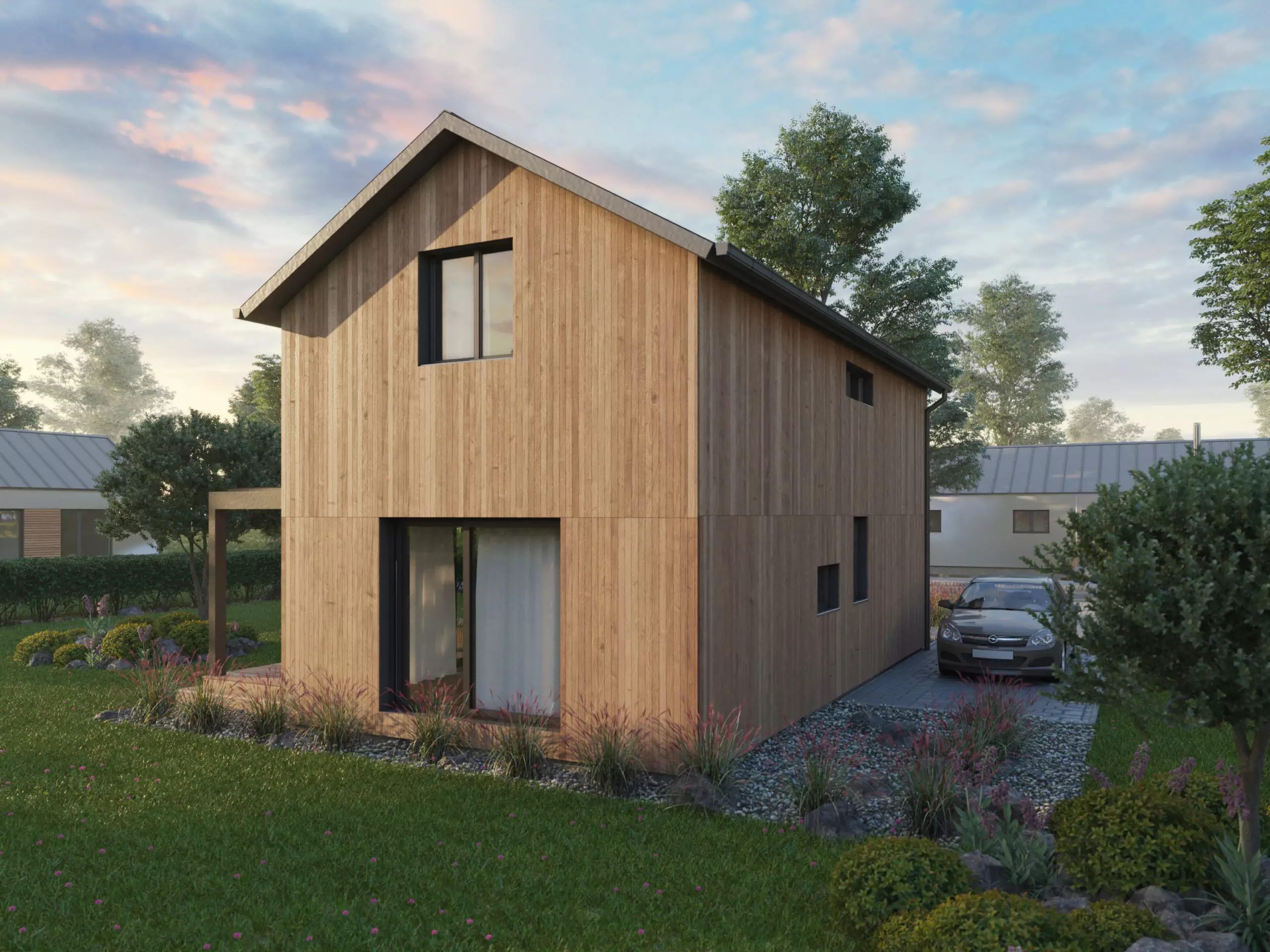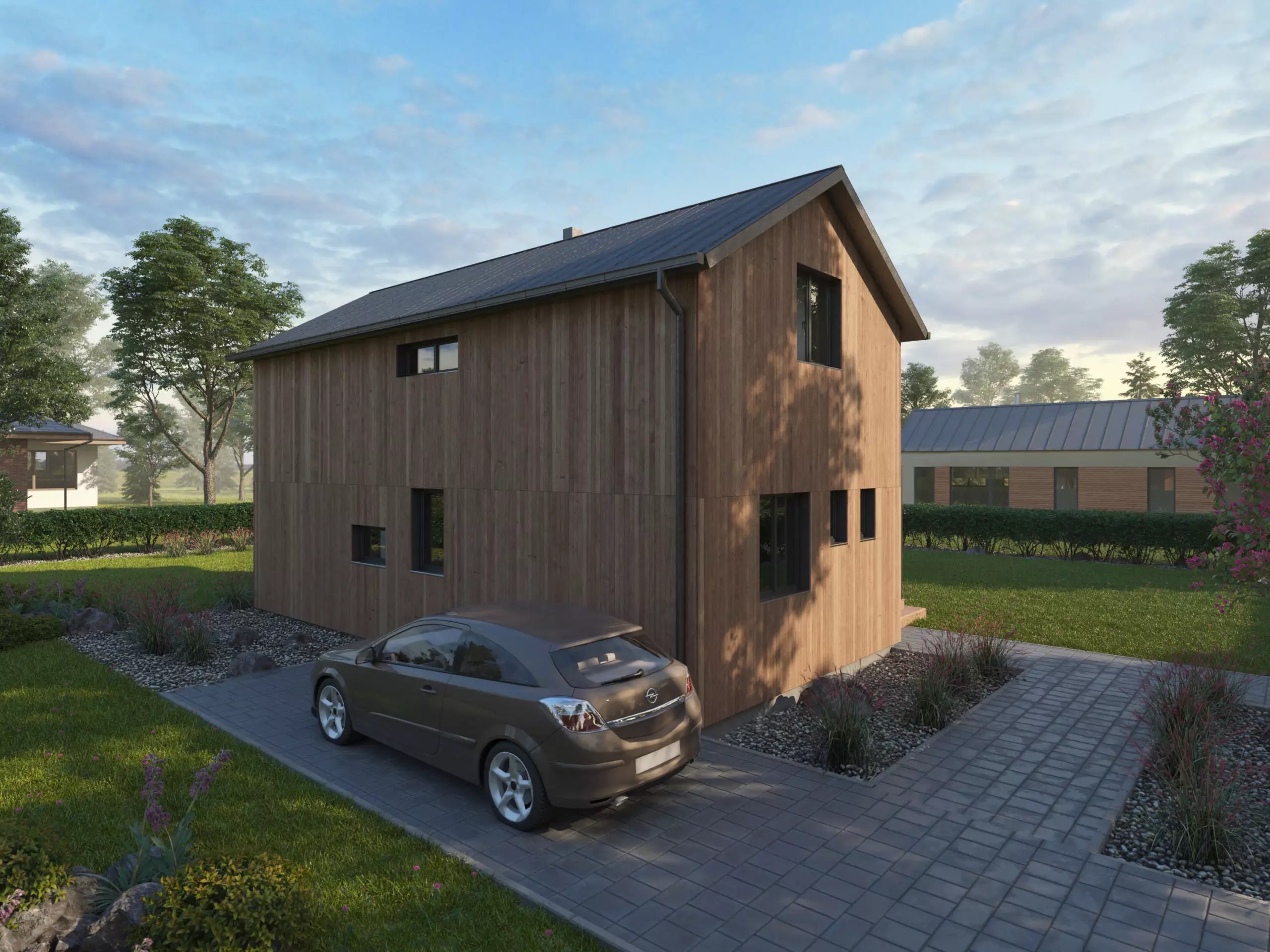 Kompaktní rodinný dům klasického vzhledu s obytným podkrovím. Použití dřevěného obkladu na fasádě dodává domu atraktivní vzhled. Dům je vhodný pro pohodlné bydlení 4-5členné rodiny.