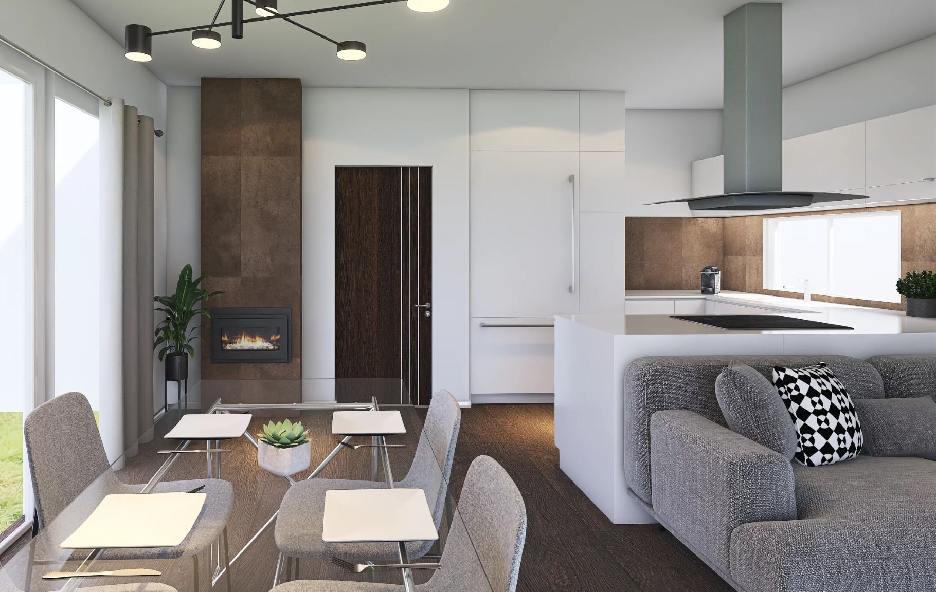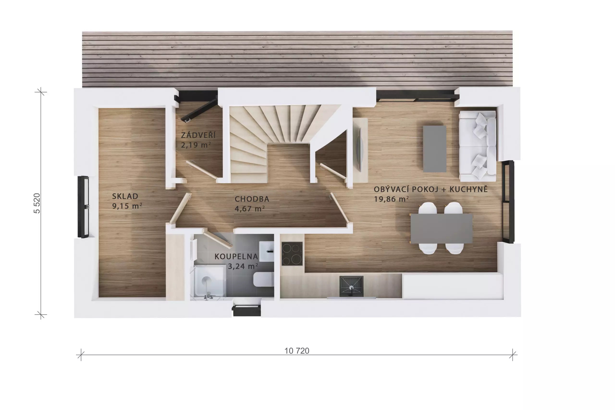 V přízemí se nachází obývací pokoj s krbem, který je propojený s jídelnou a kuchyňským koutem. Velké prosklené plochy zajišťují kromě dostatku denního světla v interiéru také jeho přirozené propojení s terasou. Dále zde najdeme koupelnu se sprchovým koutem a menší pokoj, který může sloužit jako pracovna, pokoj pro hosty, ložnice nebo třeba hobby místnost. V prostoru pod schodištěm je navržen praktický skladovací prostor.