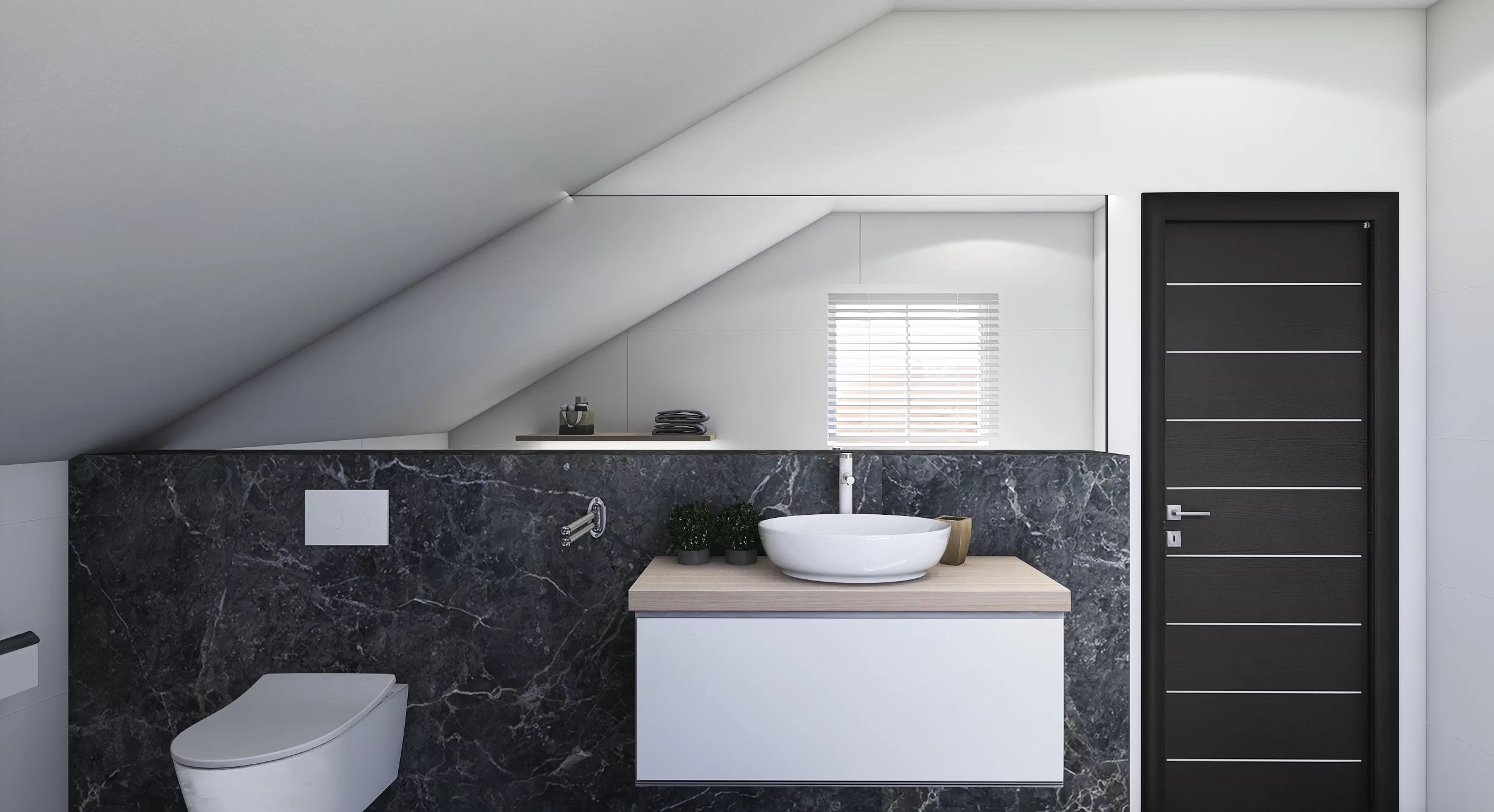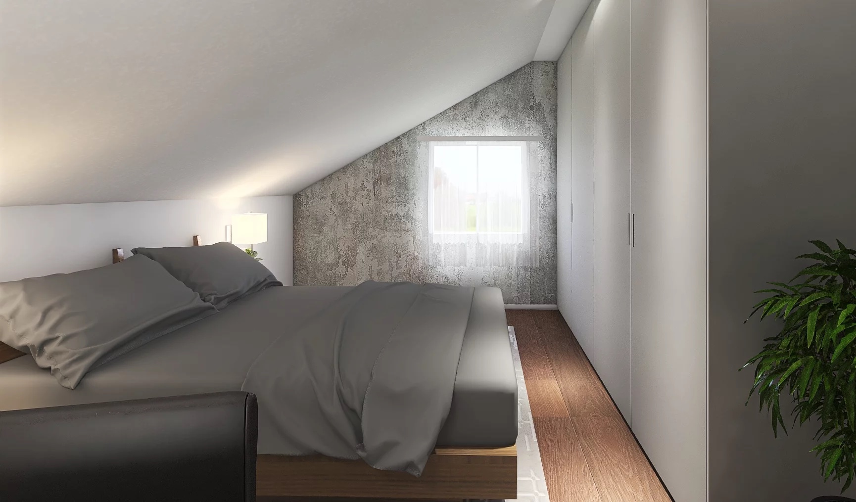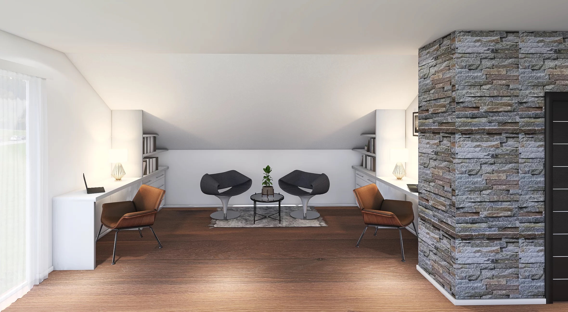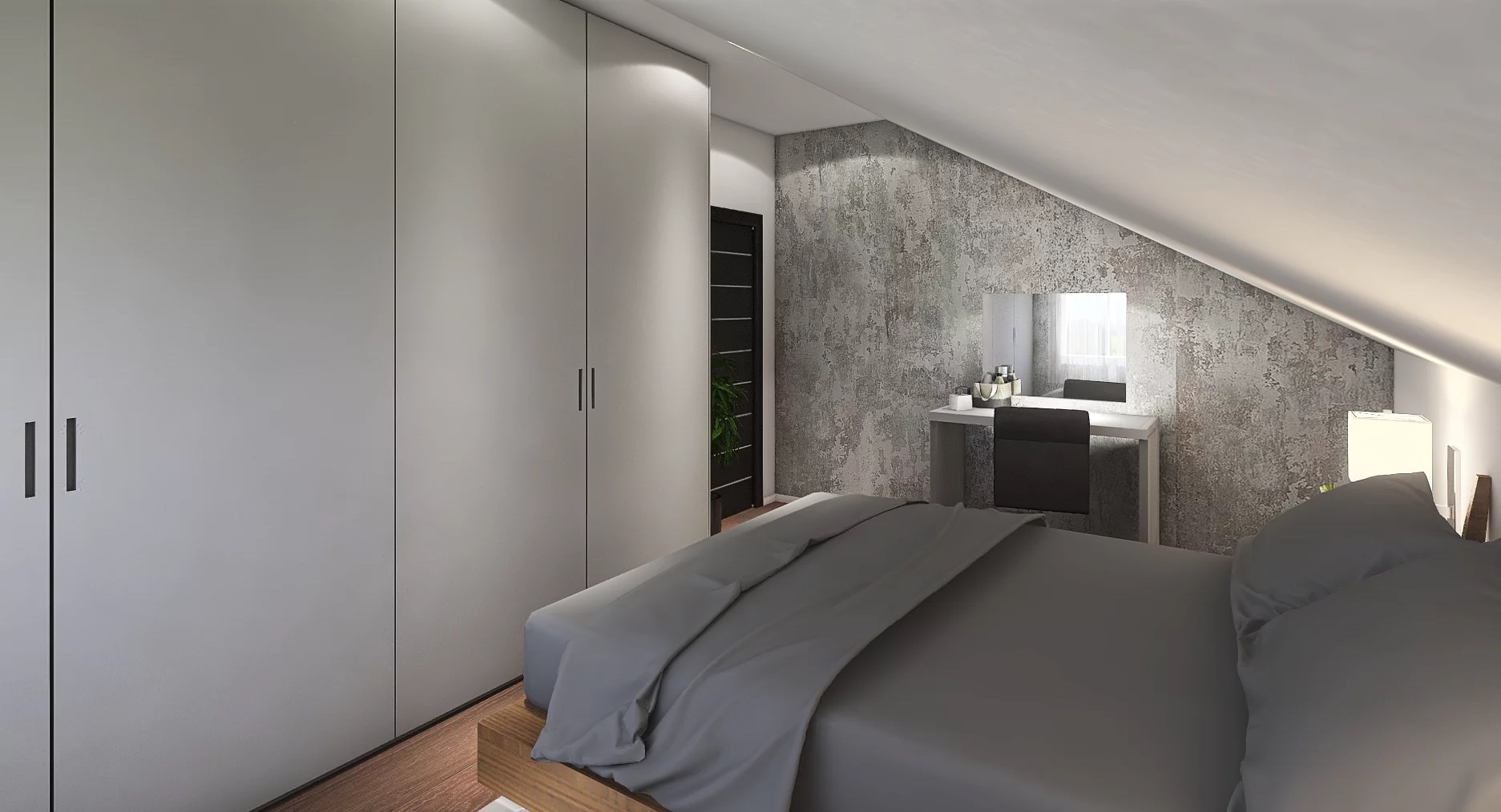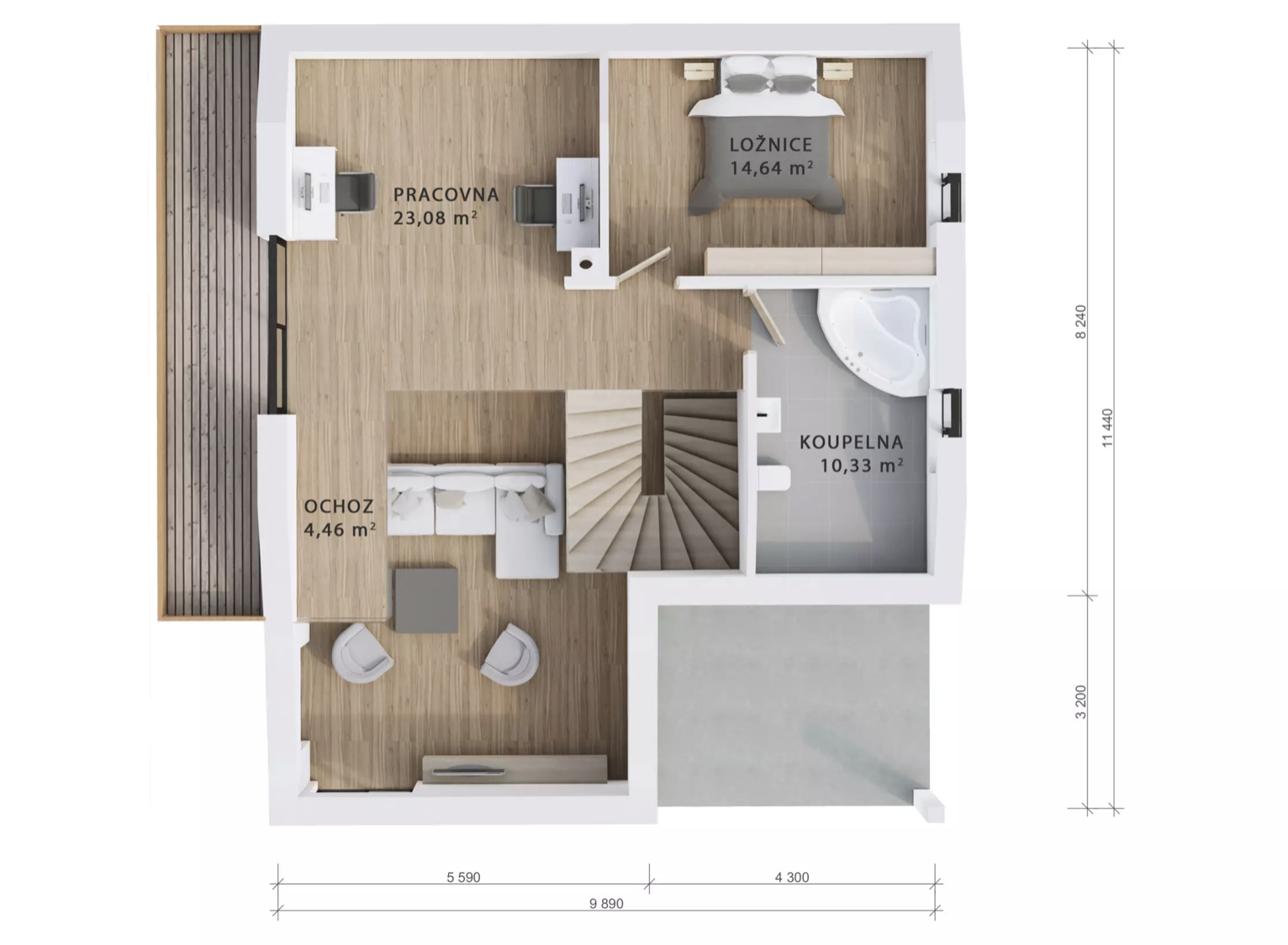 V podkroví je umístěna ložnice, koupelna s vanou a velký otevřený prostor, vzdušně propojený s obývacím pokojem, který lze využívat jako pracovnu nebo hobby místnost.