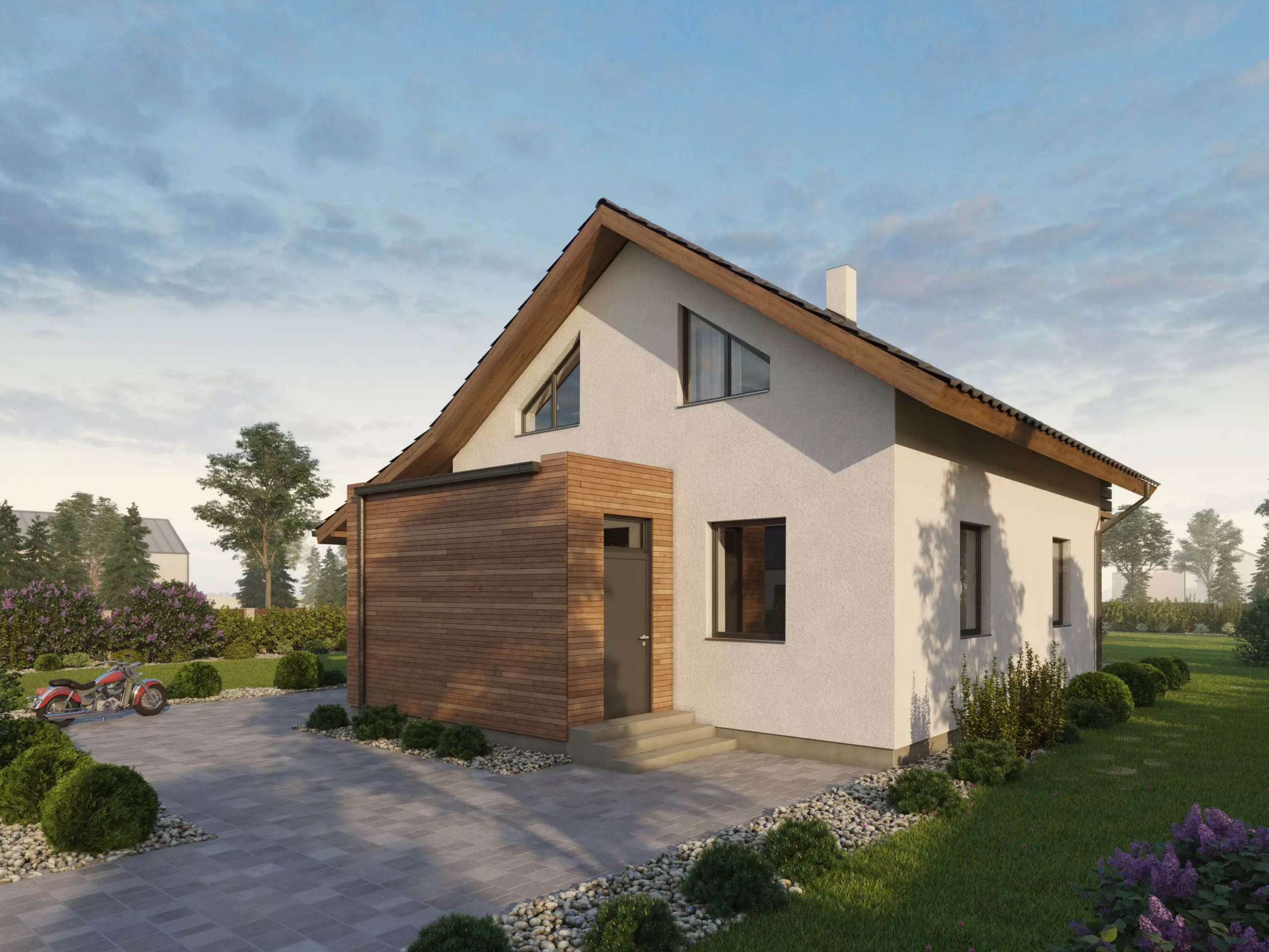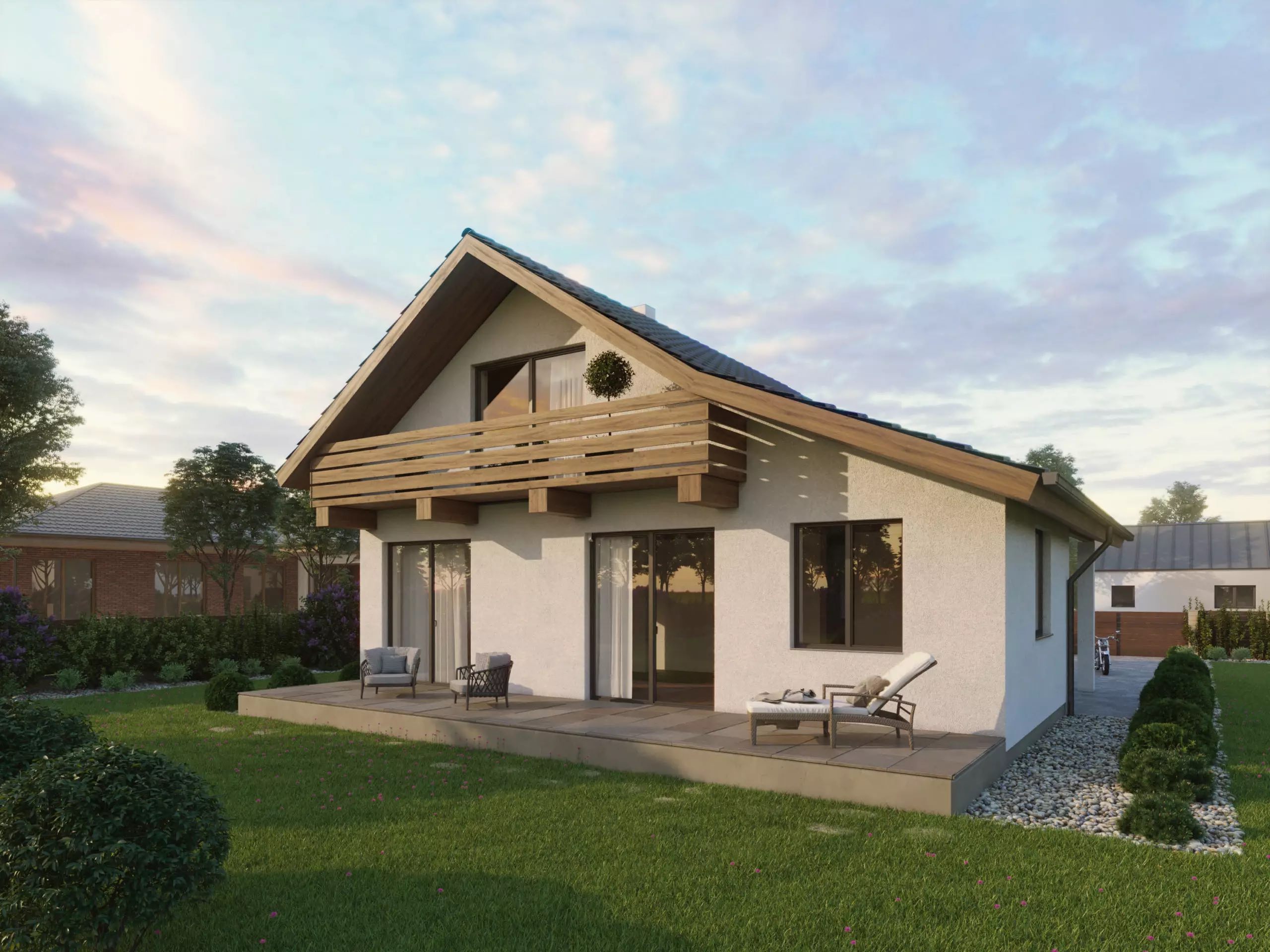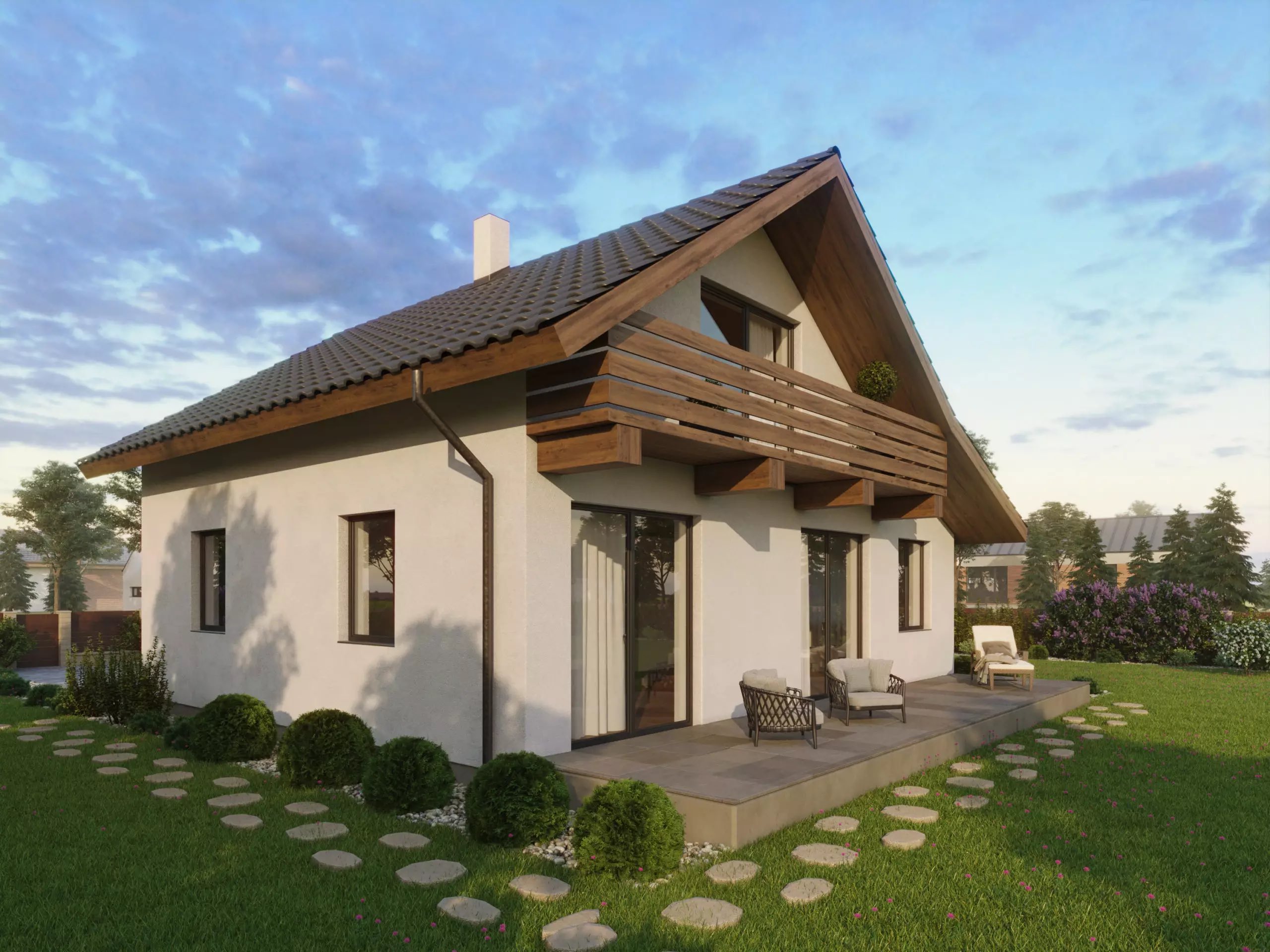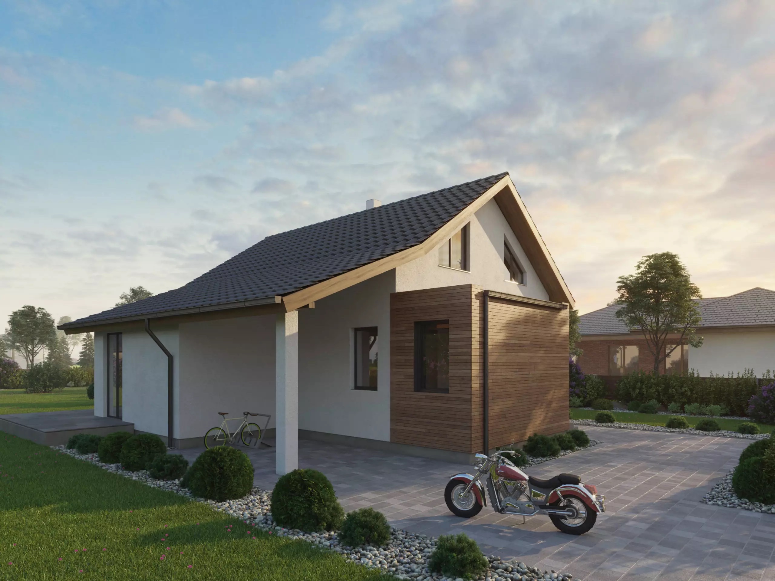 Jednoduchý, 4pokojový rodinný dům s praktickým přesahem střechy, který vytváří kryté parkovací stání. Dům je díky menší zastavěné ploše vhodný i na malé pozemky. Zajímavým architektonickým prvkem je balkon, který částečně překrývá terasu.