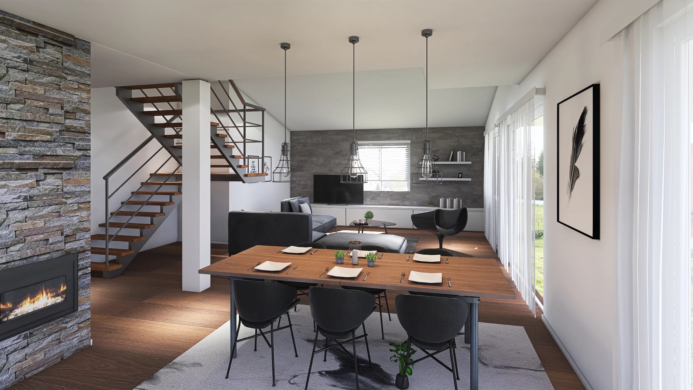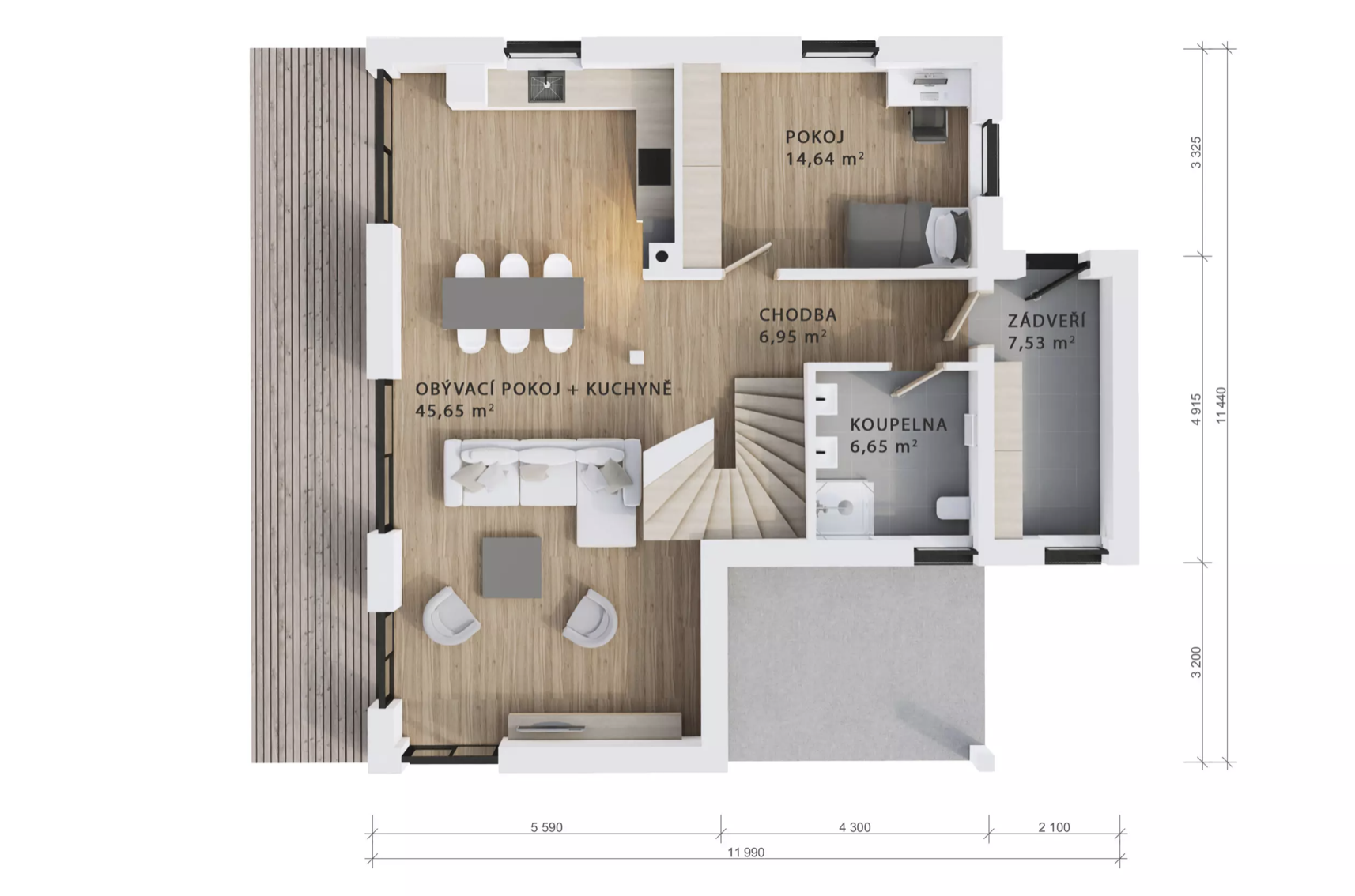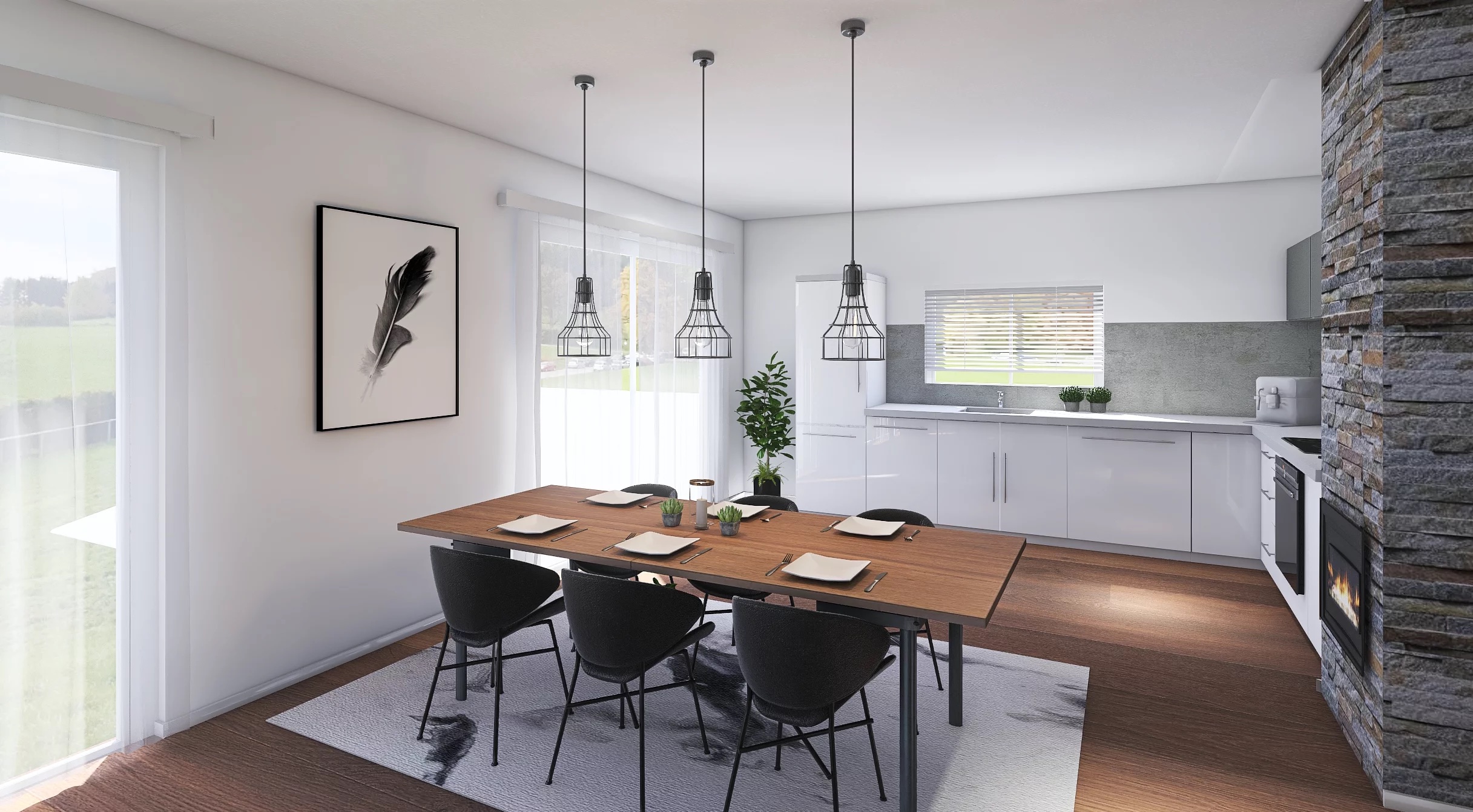 V přízemí domu se nachází rozlehlý obývací prostor s krbem, propojený s jídelnou a kuchyňským koutem. Dostatečné množství světla zajišťují francouzská okna, která nabízejí možnost vyjít z obývacího pokoje rovnou na terasu.