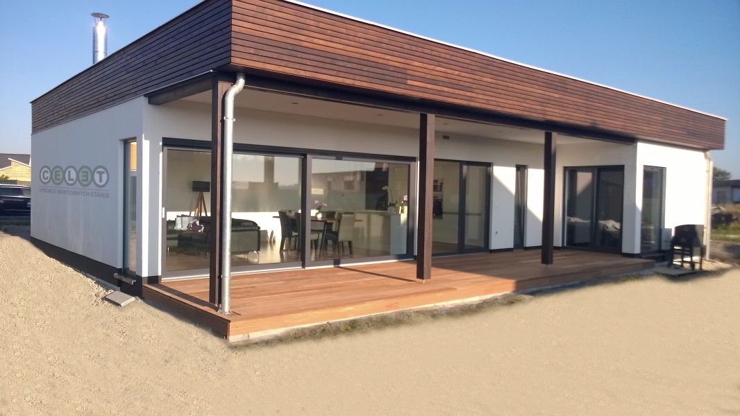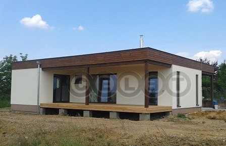 Komfortní rodinný dům typu bungalov s plochou střechou, určený pro pohodlné bydlení 4členné domácnosti. Zajímavým architektonickým prvkem je částečné obložení fasády dřevěným obkladem a terasa překrytá přesahem střechy.