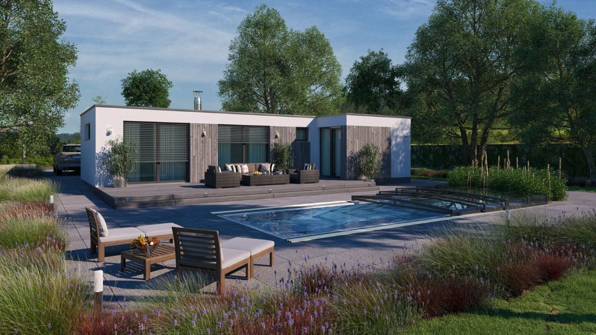 Cena zahrnuje projektovou dokumentaci, realizaci základové desky, tepelné čerpadlo, centrální větrání s rekuperací, fotovoltaiku a kompletní komínový systém.