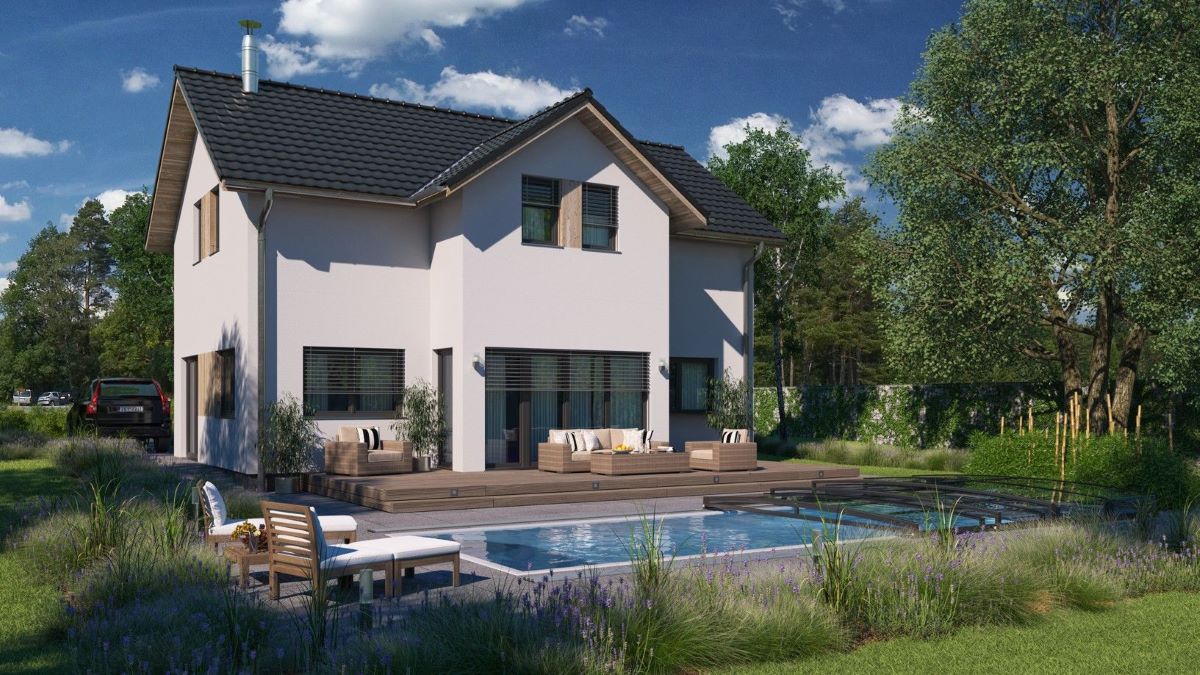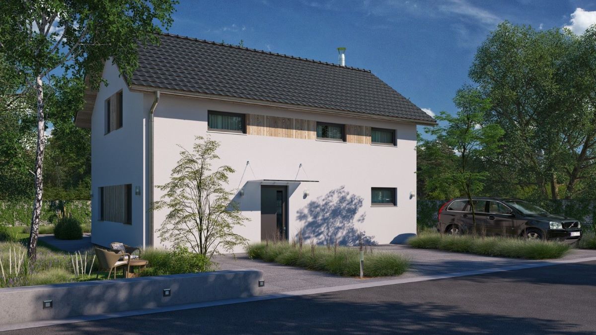 Cena zahrnuje projektovou dokumentaci, realizaci základové desky, tepelné čerpadlo, centrální větrání s rekuperací, fotovoltaiku a kompletní komínový systém.