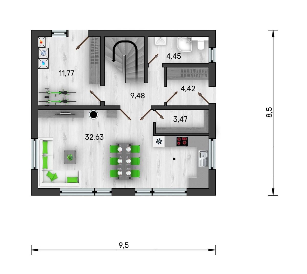 V přízemí se nachází společenská část domu tvořená velkorysým obývacím prostorem, jídelnou a kuchyňským koutem. Velká francouzská okna přivádí do interiéru dostatek denního světla a zároveň ho propojují s terasou a zahradou. Součástí obývacího pokoje je také krb, který vytvoří útulnou atmosféru nejen v zimních měsících.