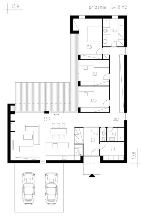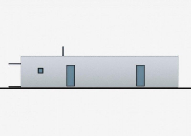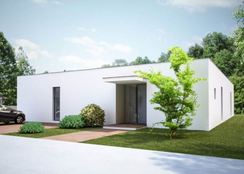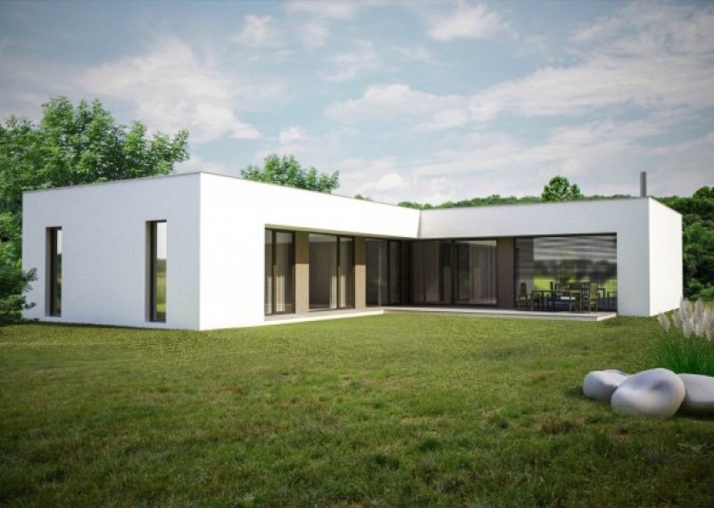 Moderní, nadčasový bungalov s jednoduchými a čistými liniemi. Dům na půdorysu ve tvaru L umožňuje orientaci všech obytných místností na soukromou terasu. Zajímavým architektonickým prvkem je přesah střechy chránící terasu.
