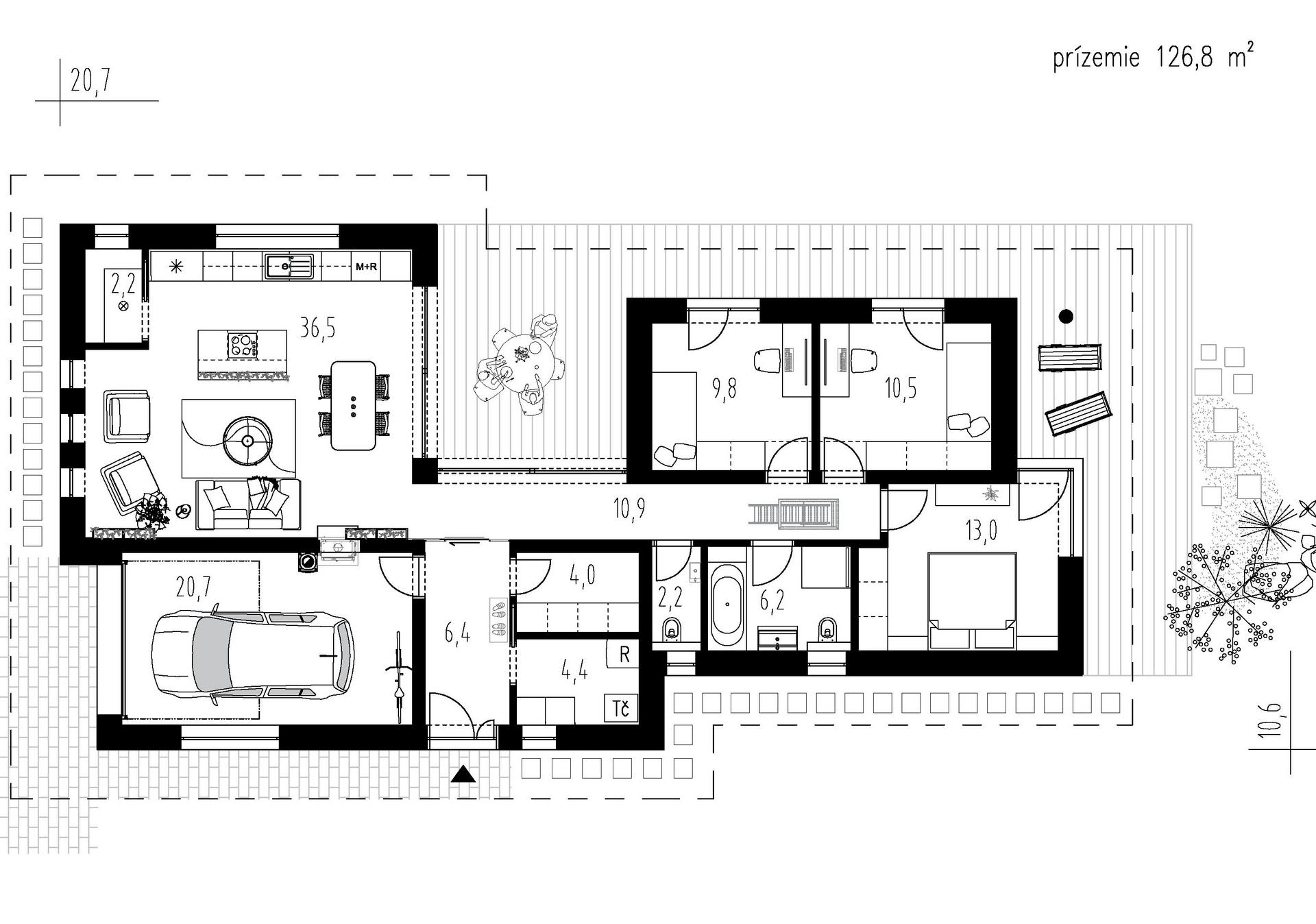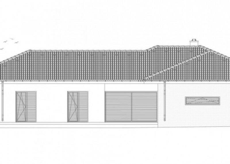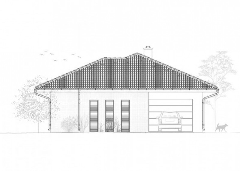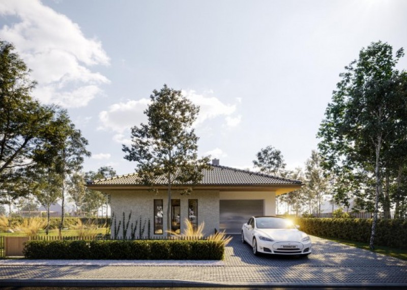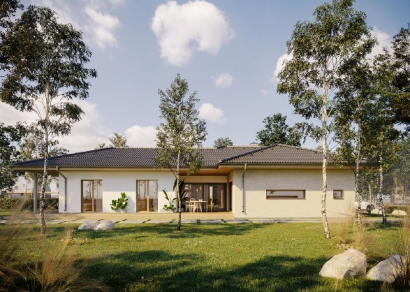 Moderní rodinný dům typu bungalov, který má dvě kryté terasy a garáž. Dům je ideální pro pohodlné bydlení 4členné domácnosti.
