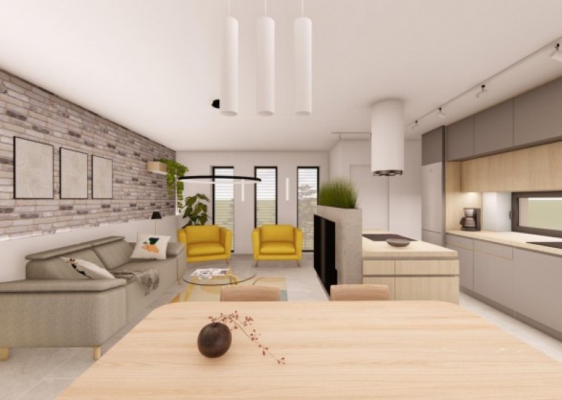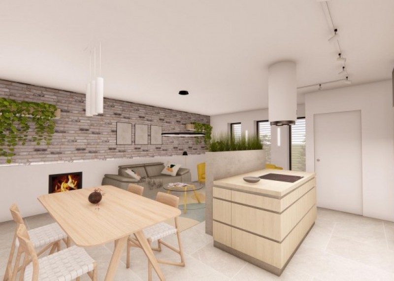 Dům je prakticky rozdělen chodbou na denní a noční část. Denní část domu tvoří prostorný obývací pokoj s krbem, který je propojený s jídelnou a kuchyňským koutem. V kuchyni je navržen varný ostrůvek a najdeme zde i praktickou spíž pro pohodlné ukládání potravin. Velké francouzské okno propojuje společenskou místnost se zastřešenou terasou, která nabádá ke stolovaní a relaxaci i za nepříznivého počasí.