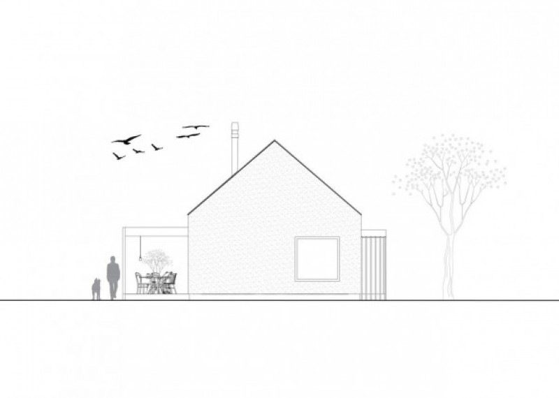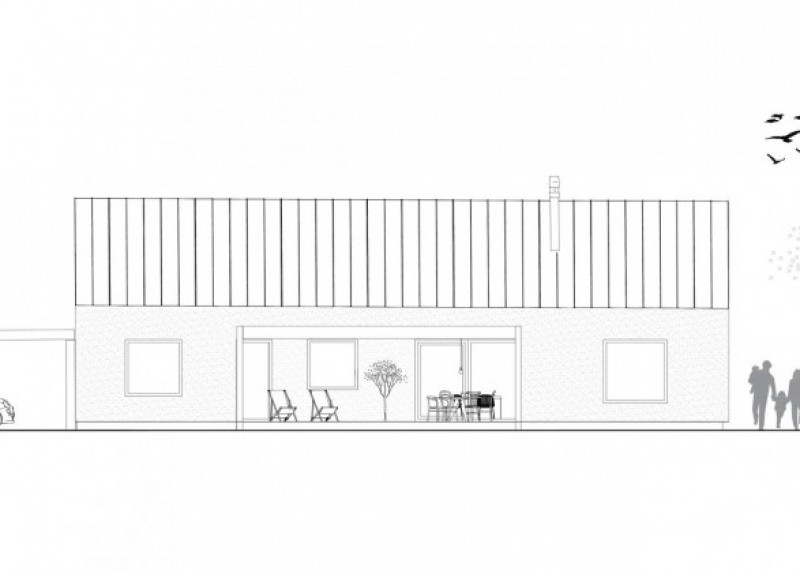 Jednoduchý bungalov s velkými čtvercovými okny a sedlovou střechou, který uspokojí nároky 4členné rodiny.