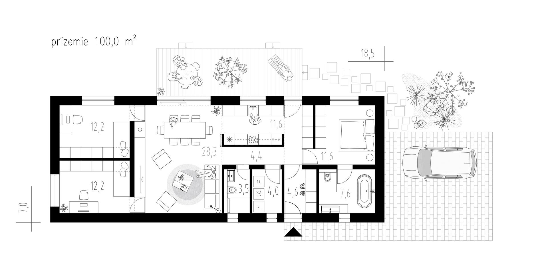 Společenskou část domu tvoří obývací pokoj spojený s jídelnou a opticky odděleným kuchyňským koutem. Pro vytvoření útulné atmosféry nechybí ani krb. Dostatečné množství světla zajišťuje velké francouzské okno, které nabízí možnost vyjít z obývacího pokoje rovnou na terasu. Z místa nad kuchyní, WC a technickou místností lze získat další prostor, který lze využívat například jako hernu.