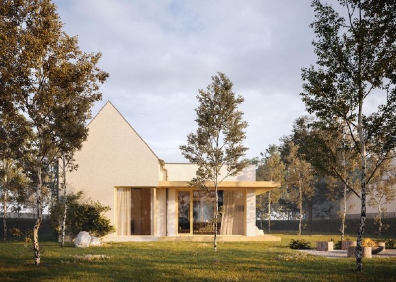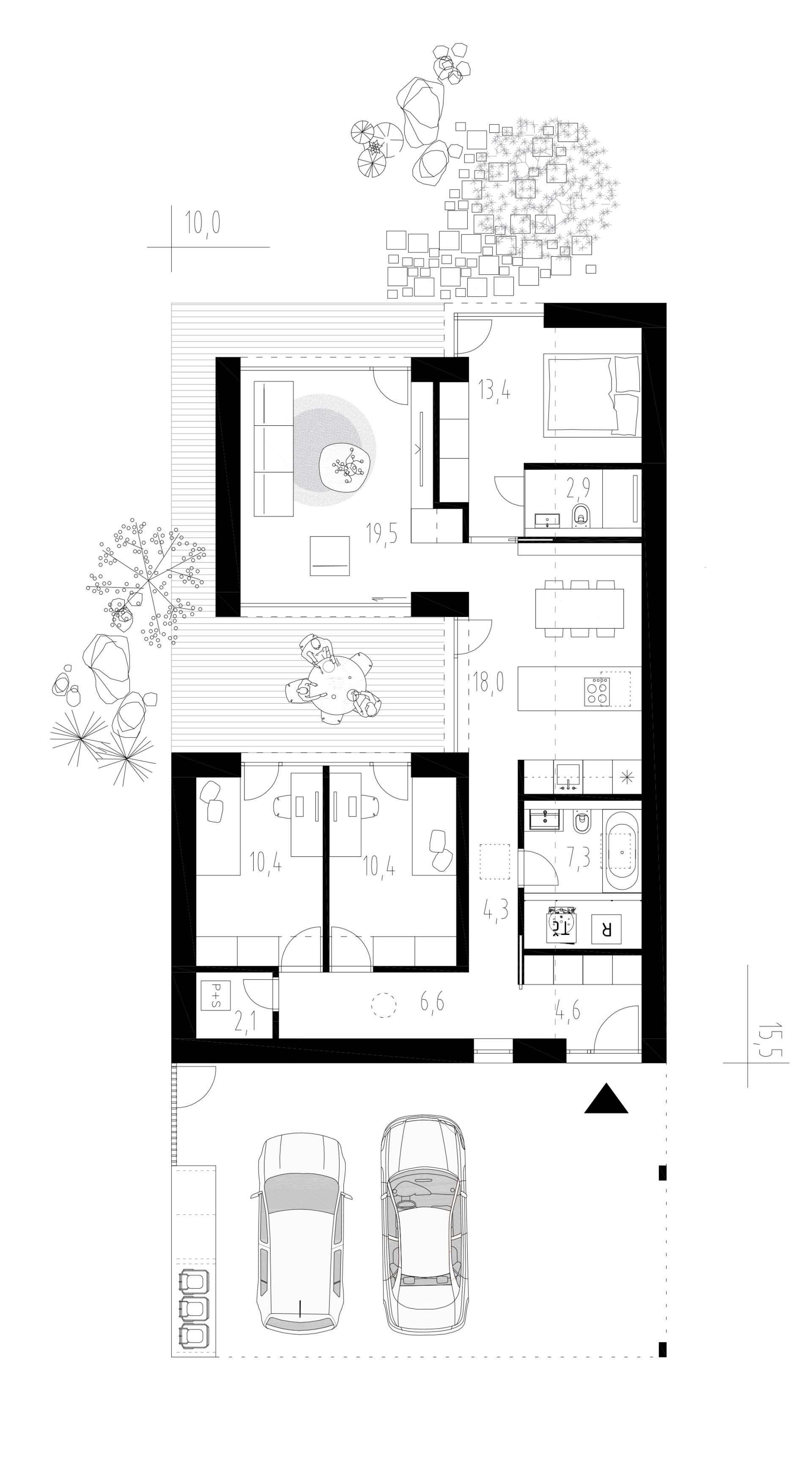 Originální přízemní dům se zajímavou kombinací sedlové a rovné střechy. Dům je vhodný pro pohodlné bydlení 4-5členné rodiny. Architektura domu se přirozeně uzavírá a tím vzniká chráněná terasa ve formě atria.