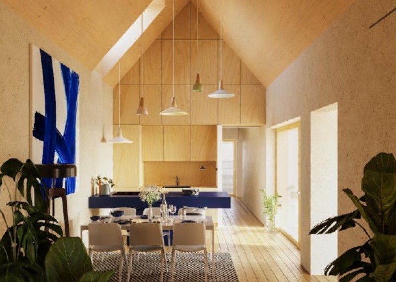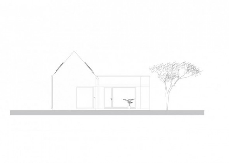 Denní část domu tvoří obývací prostor, který prosvětlují velké skleněné stěny, zaručující dokonalé propojení místnosti s exteriérem domu. Prostor kuchyňského koutu s jídelnou je otevřen do celé výšky stropu a je opticky oddělen od obývací části.