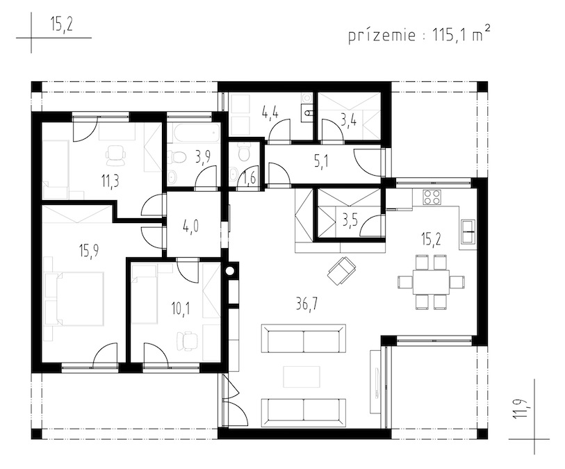 Dům je členěn na společenskou a privátní část. Společenská je tvořena obytným prostorem s krbem, který je propojený s jídelnou a kuchyňským koutem. Pro pohodlné skladování potravin je zde navržena spíž. Bohaté prosklené plochy jsou zárukou dokonalého prosvětlení interiéru a přirozeného propojení s terasou.