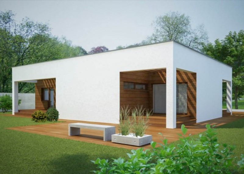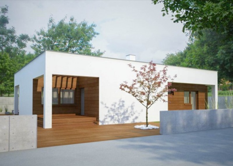Moderní, atypický 4pokojový bungalov s plochou střechou a čistými liniemi. Charakteristickým prvkem domu je výstup na krytou terasu ze všech pokojů.
