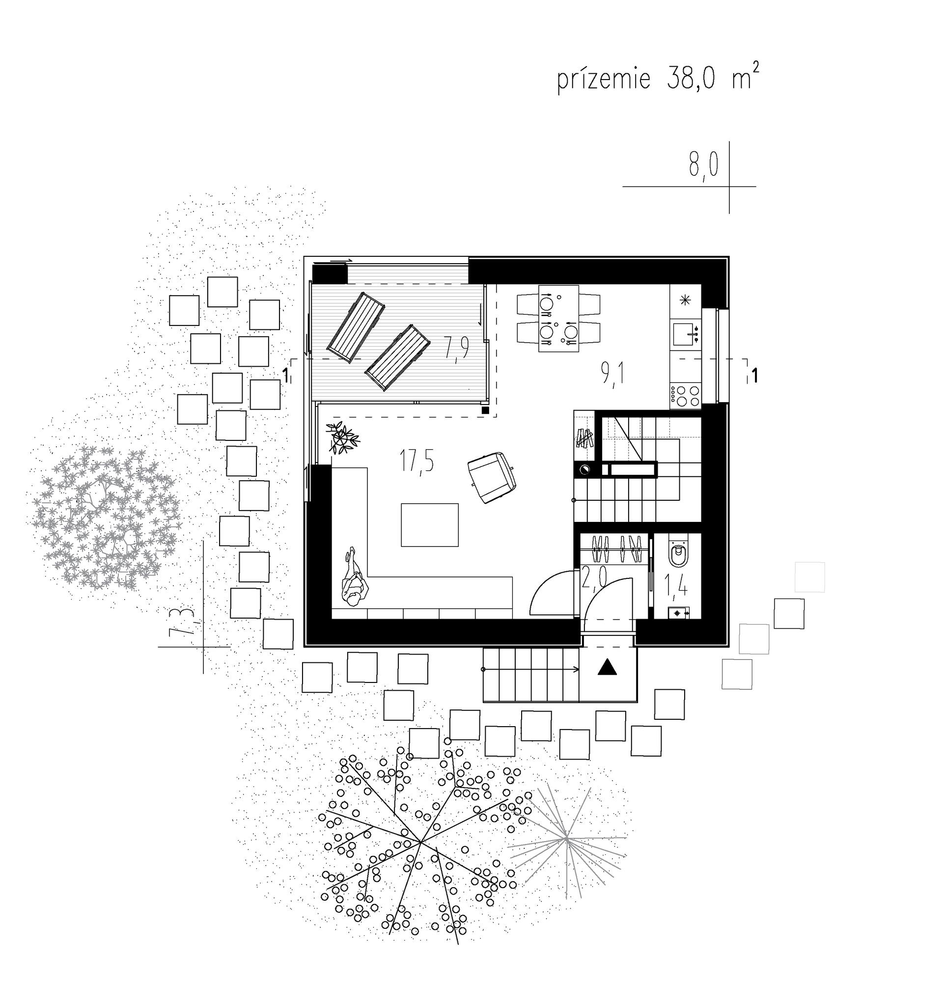 Obytný prostor s krbem je propojen s jídelnou a kuchyňským koutem. Dokonalé prosvětlení interiéru zajišťují velká francouzská okna, která umožňují vstup na terasu krytou dřevěnými posuvnými panely. V přízemí nechybí ani samostatné WC.