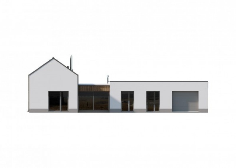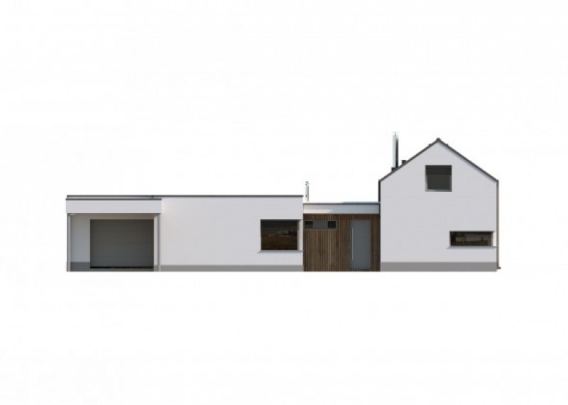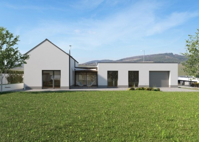 Moderní, elegantní bungalov s garáží. Zajímavým architektonickým prvkem je kombinace sedlové a ploché střechy. Dům svými vnitřními prostory uspokojí nároky na bydlení 4-5členné rodiny.
