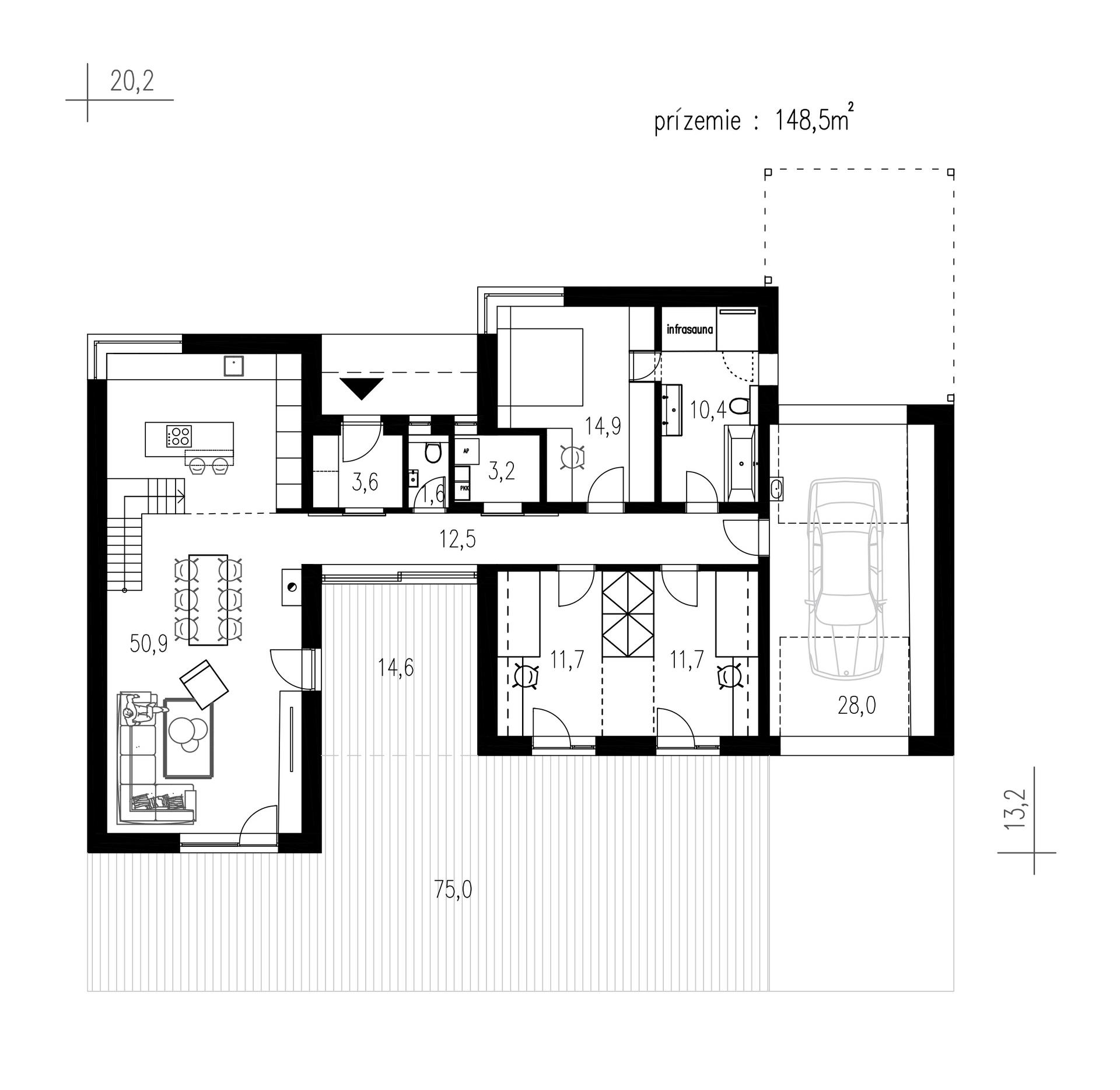 Noční zónu najdeme pod rovnou střechou. Nachází se zde 2 dětské pokoje s francouzskými okny a výstupem na terasu a ložnice se vstupem do společné koupelny, kde je kromě vany a sprchového koutu navržena také infrasauna.