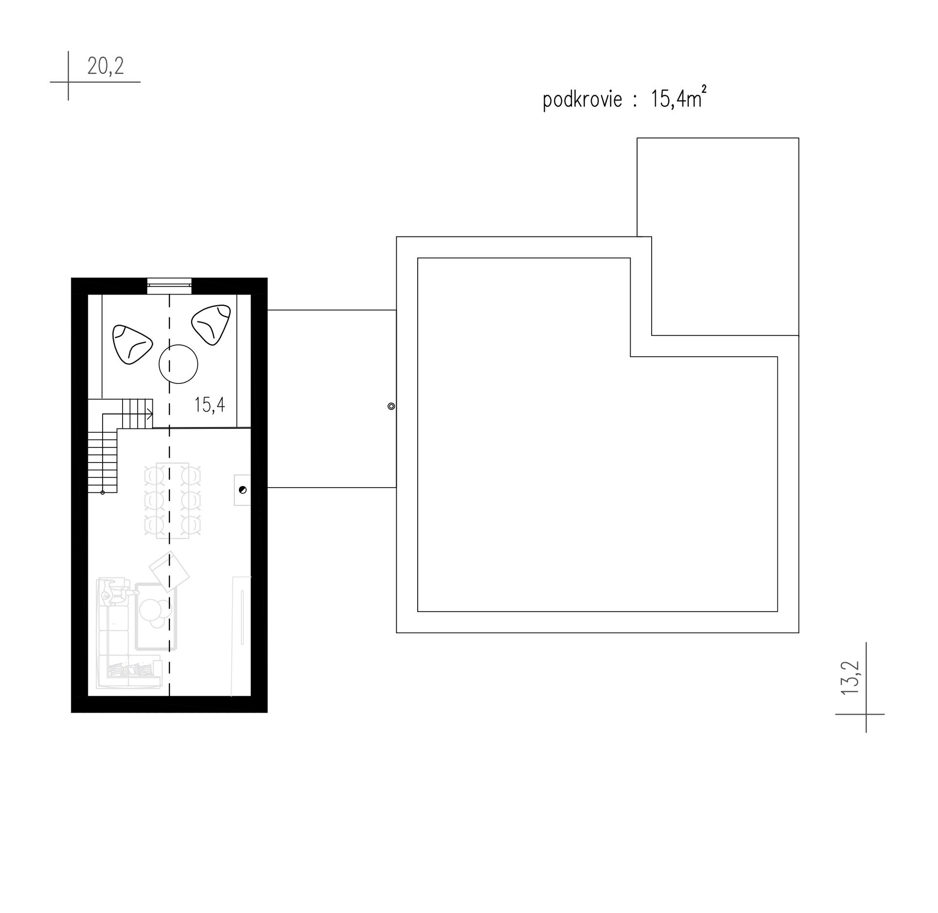 Dům je rozdělen na společenskou a privátní část. Společenský prostor se nachází v části domu, kde je navržena sedlová střecha. To umožňuje provzdušnění místnosti otevřením stropu a dává vzniknout místu nad kuchyní v podobě malého ateliéru nebo čítárny.