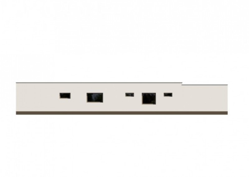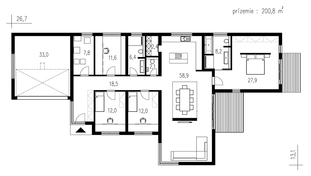 Společenskou část domu tvoří obytný velkoprostor, propojený s jídelnou a kuchyňským koutem. Pro pohodlné skladování potravin je zde navržena praktická spíž. Velká francouzská okna zajišťují dostatek denního světla v interiéru a jeho přirozené propojení s krytou terasou.