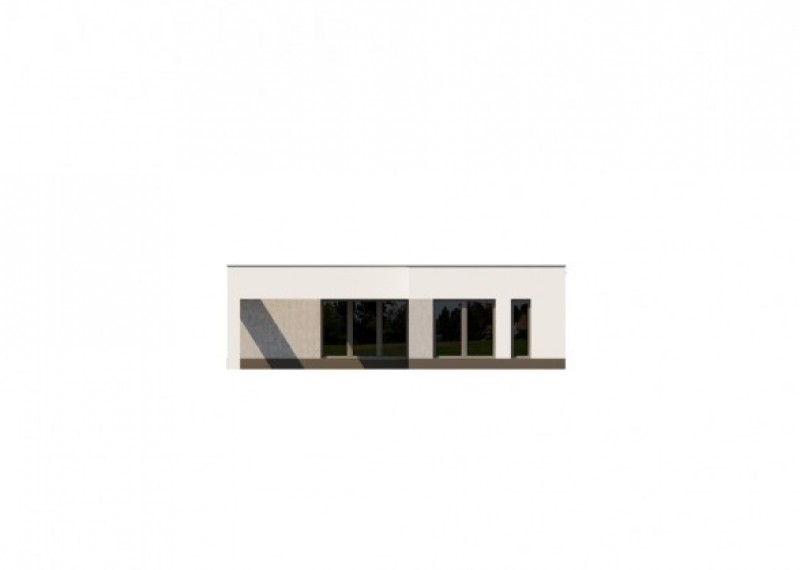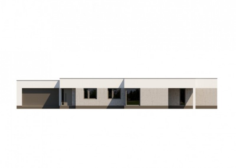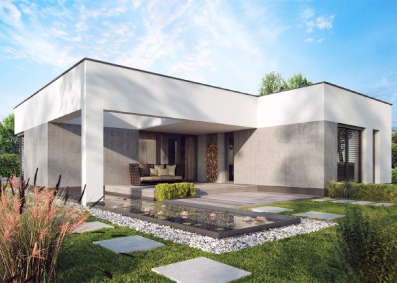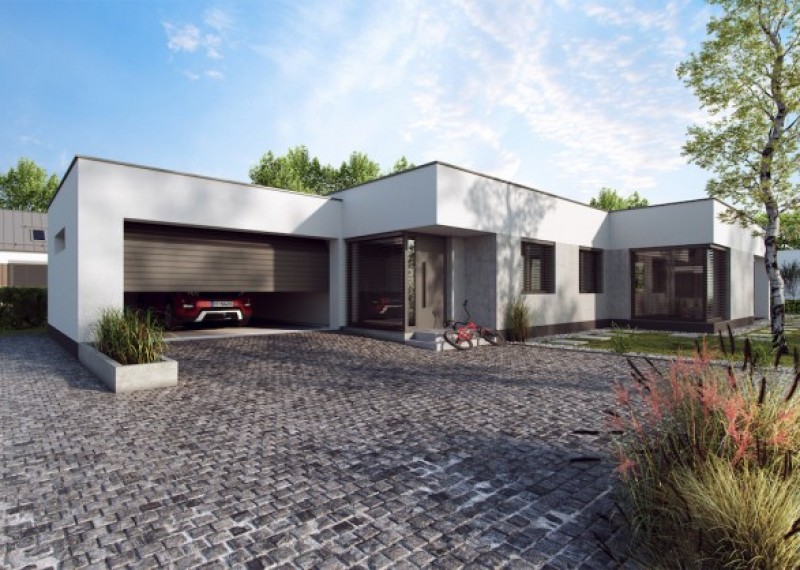 Elegantní, moderní rodinný dům typu bungalov s plochou střechou a garáží pro 2 auta. Zajímavým a zároveň praktickým prvkem domu je terasa a vstup překryté hmotou střechy.