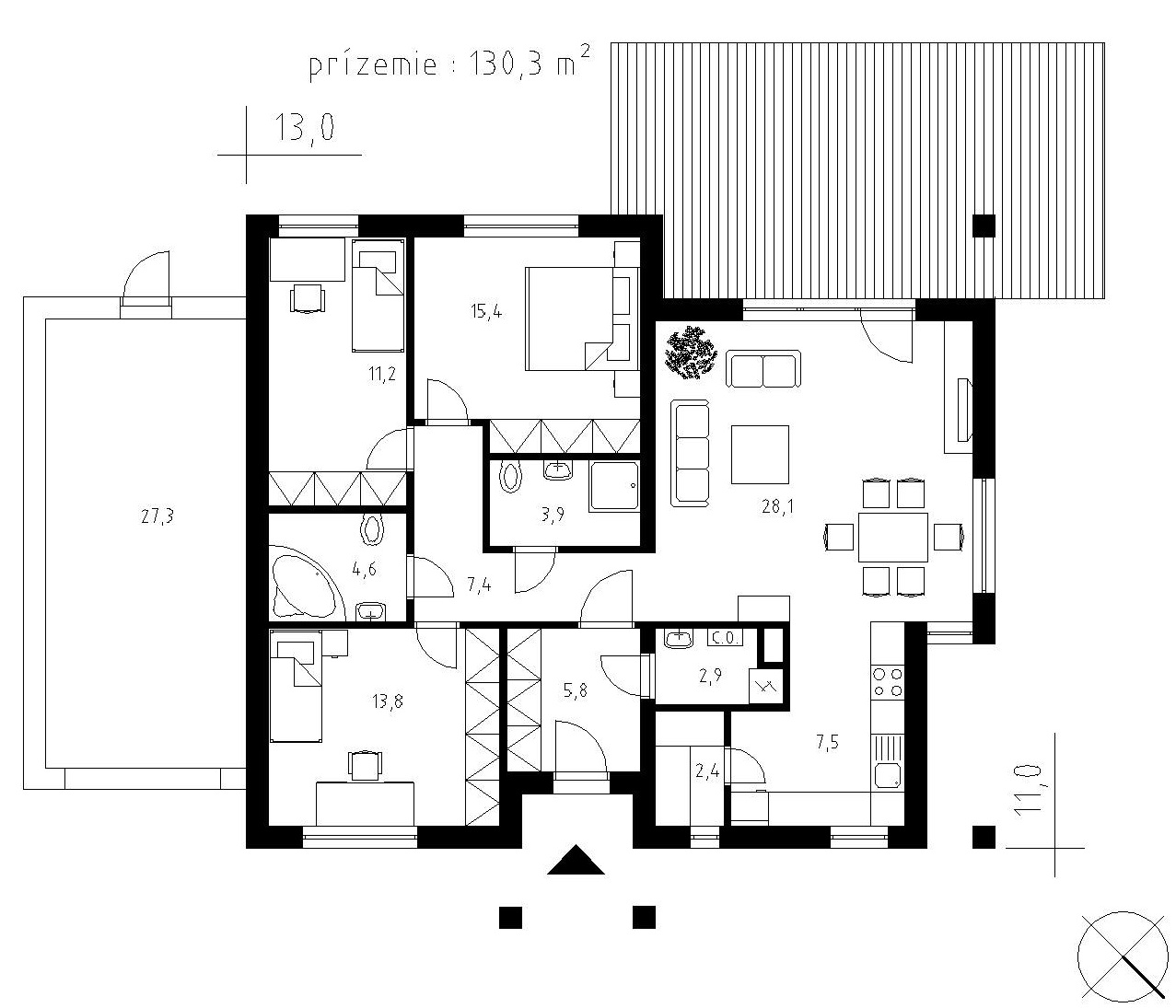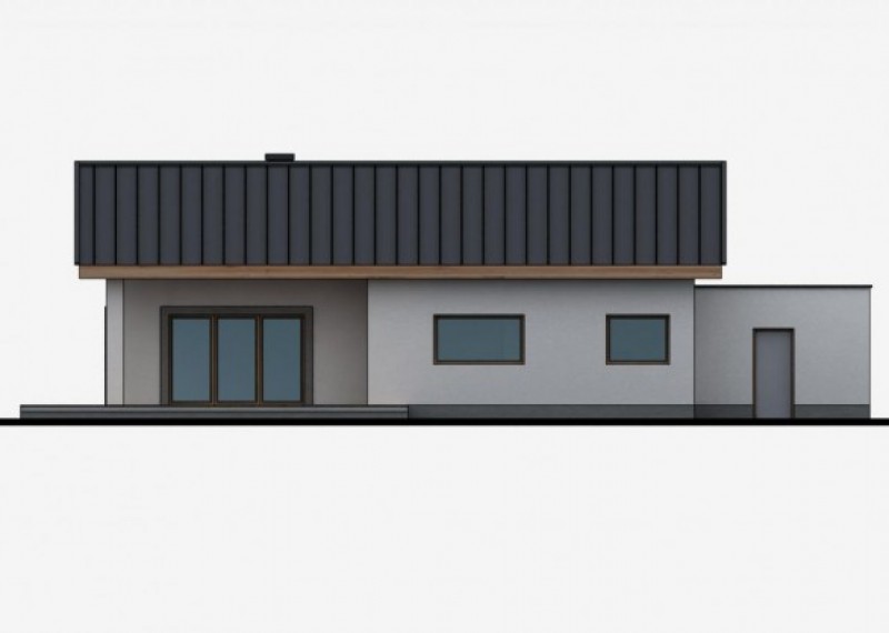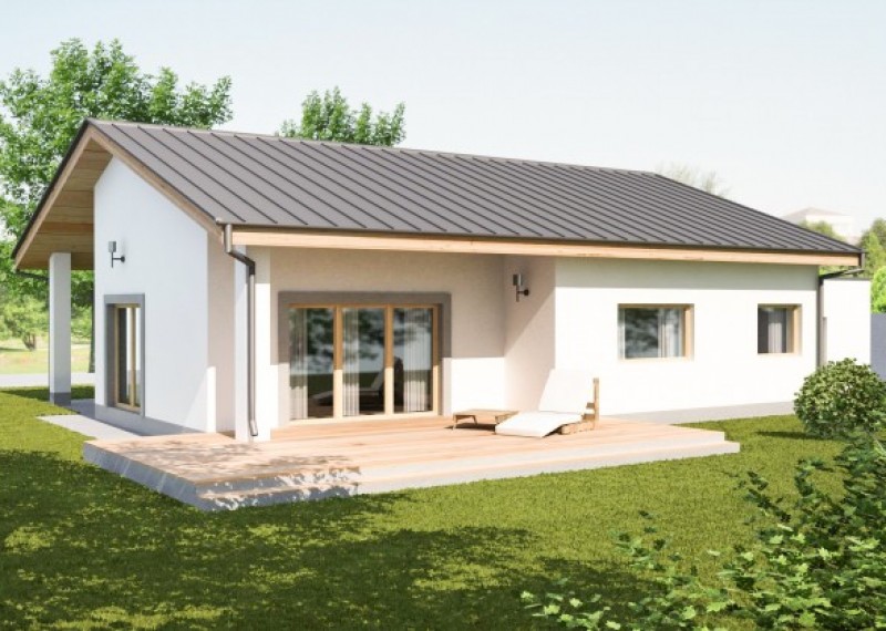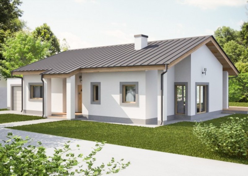 Praktický, 4pokojový bungalov se sedlovou střechou, ideální pro pohodlné bydlení rodiny se 2-3 dětmi. Praktickým prvkem je přesah střechy chránící vstup do domu i část terasy.