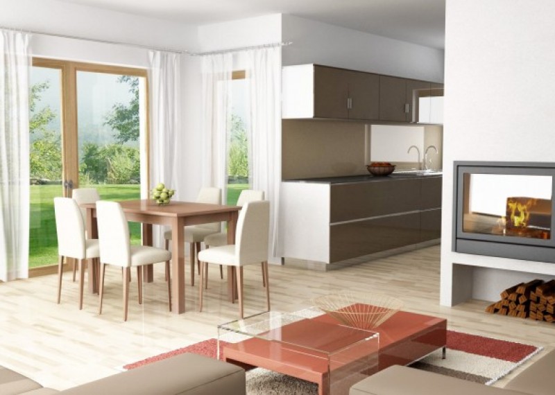 Dům je rozdělen na společenskou a privátní část. Společenskou tvoří obytný prostor propojený s jídelnou a kuchyňským koutem, kde najdeme i spíž pro pohodlné skldování potravin. Velká francouzská okna se starají o dokonalé prosvětlení interiéru a jeho přirozené propojení s terasou.