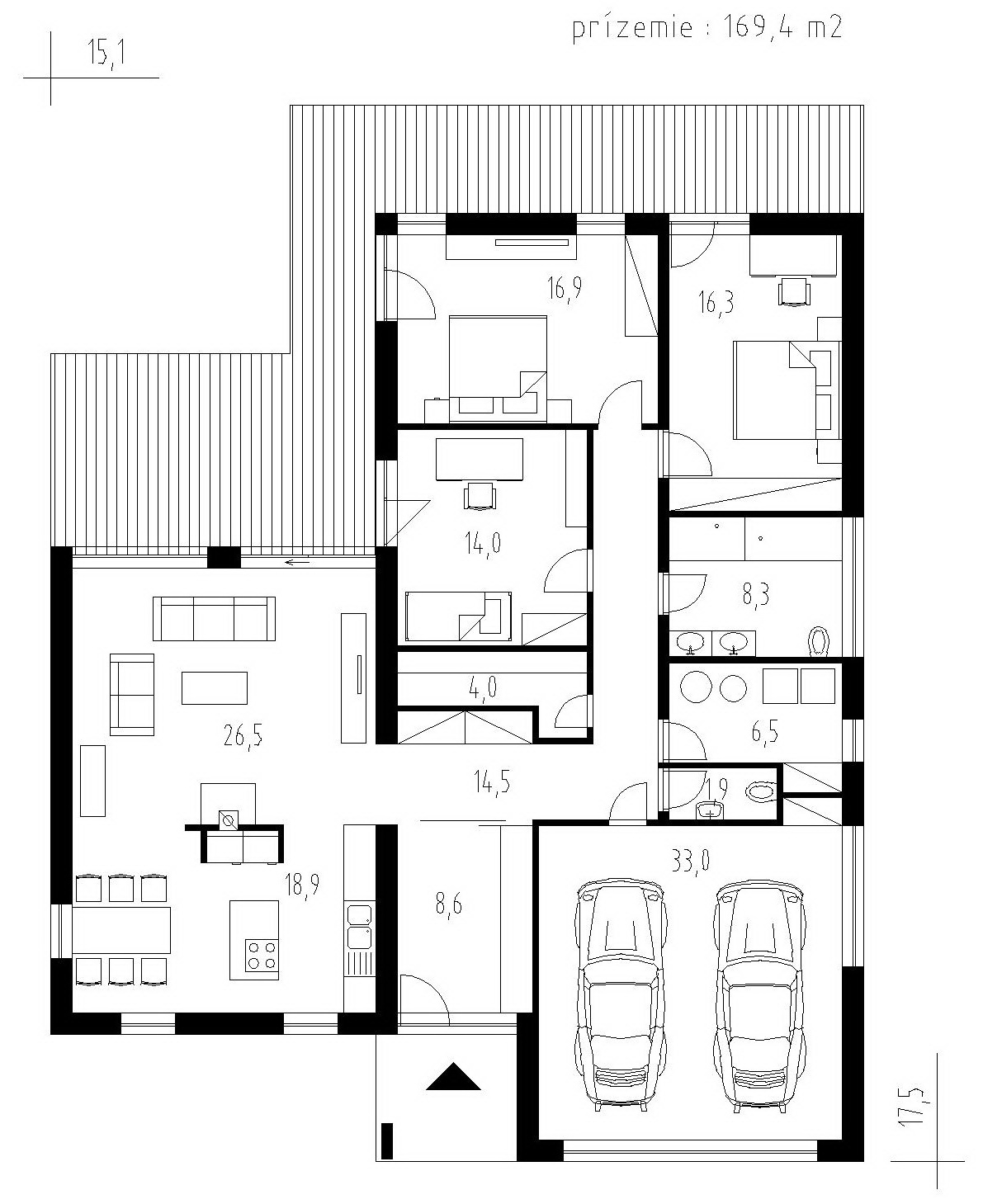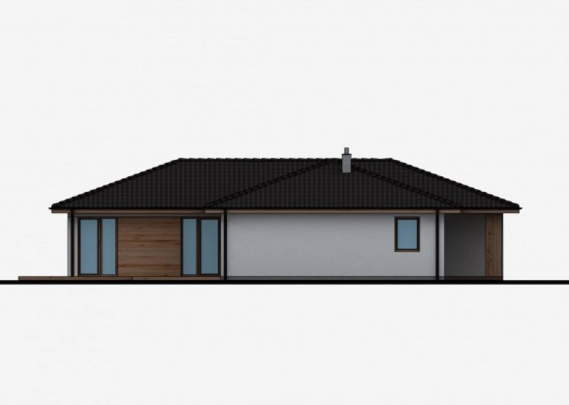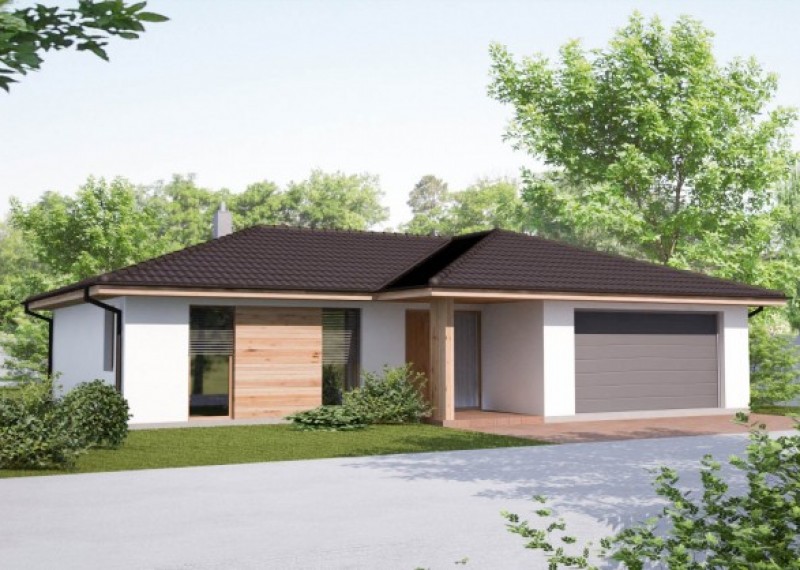 Kompaktní, 4pokojový rodinný dům typu bungalov klasického vzhledu s integrovanou garáží pro 2 auta. Půdorys domu ve tvaru L zajišťuje dokonalé soukromí na terase a výstup na ni ze všech pokojů.