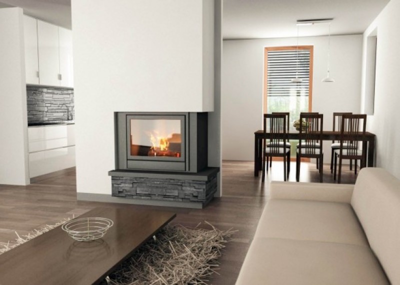 Společenská část domu je tvořena obytným velkoprostorem s centrálně umístěným krbem, který odděluje jídelnu a kuchyňský kout. Velké prosklené plochy dokonale prosvětlují interiér a zaručují ničím nerušený výhled do zahrady.