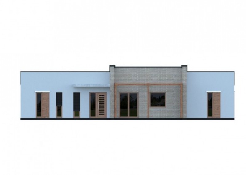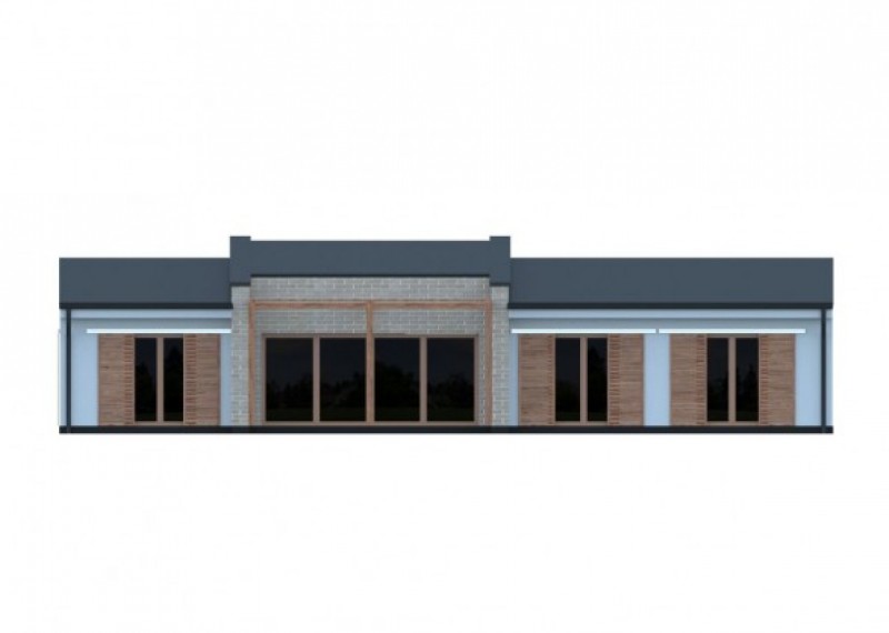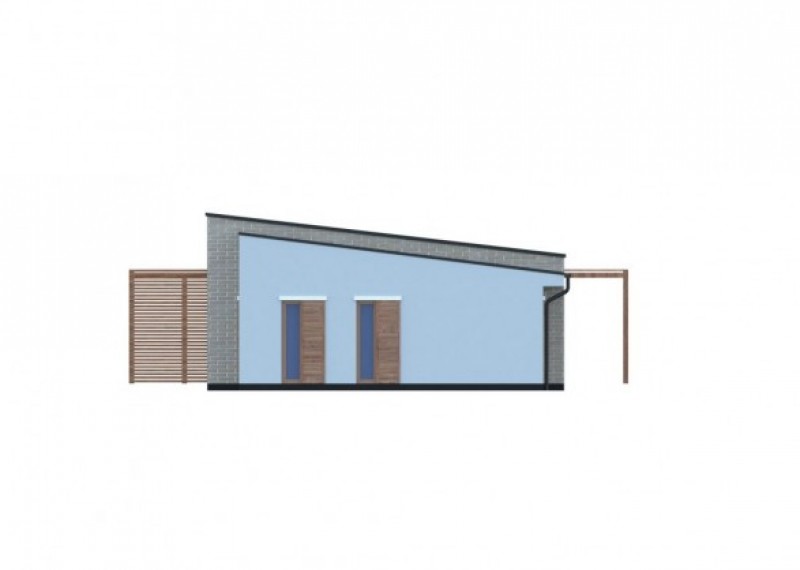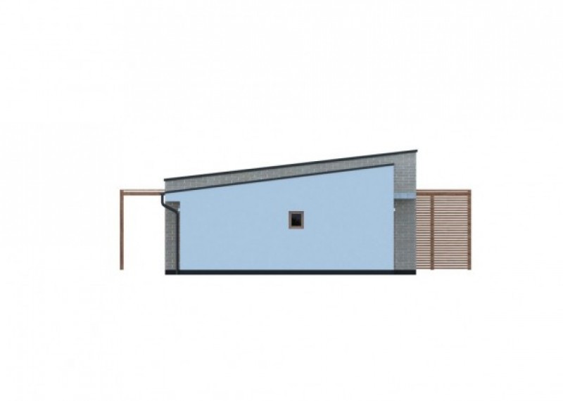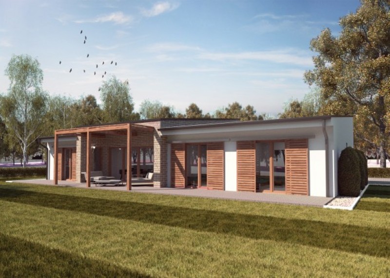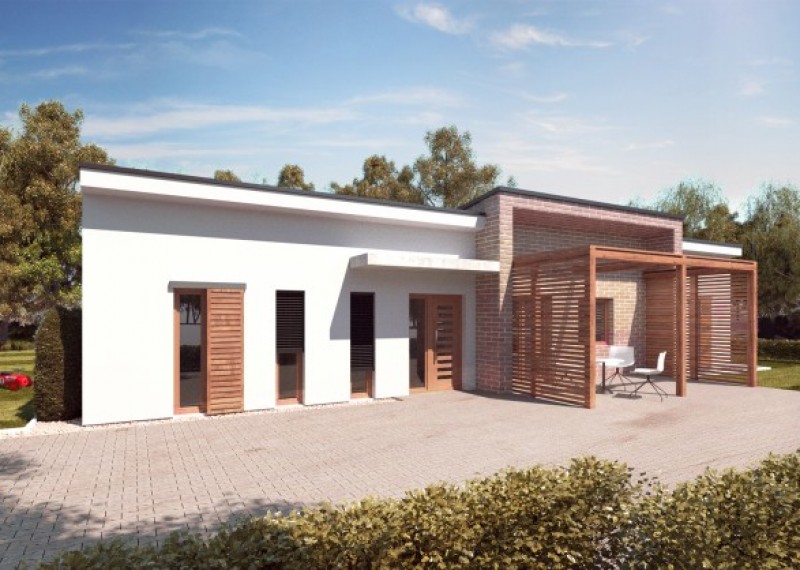 Kompaktní rodinný dům typu bungalov s členitou pultovou střechou, který se hodí i na úzké parcely. Atraktivním prvkem domu je cihlový obklad na části fasády a stylové dřevěné okenice. Všechny obytné místnosti jsou francouzskými okny orientovány do zahrady.