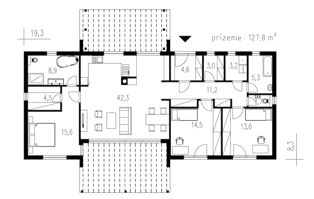 Centrální část půdorysu domu tvoří obývací prostor se zvýšeným stropem a krbem, na který navazuje jídelna s kuchyňským koutem. Velké prosklené stěny ve společenské místnosti prostor dokonale prosvětlují a umožňují vstup na dvě přilehlé terasy.